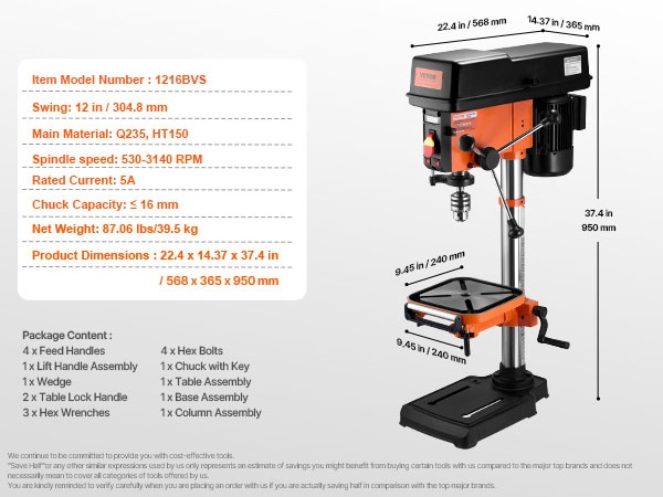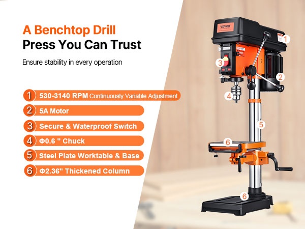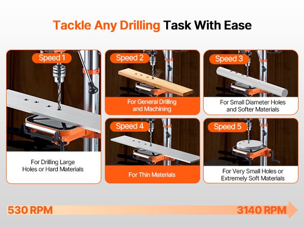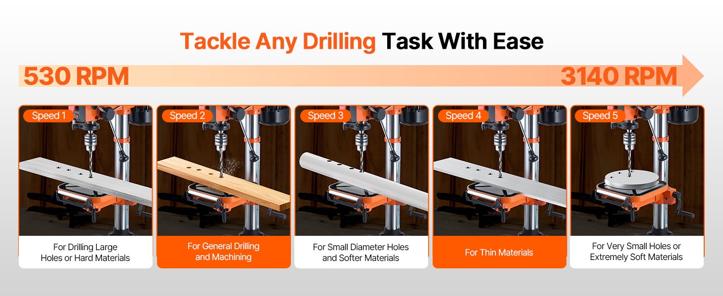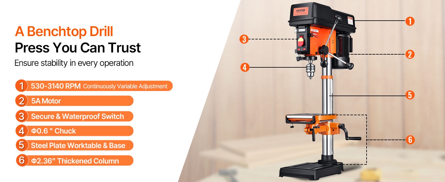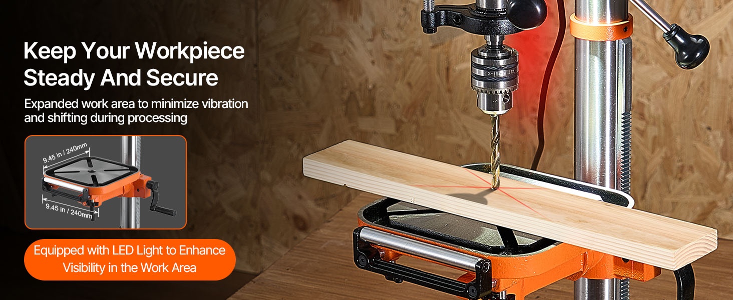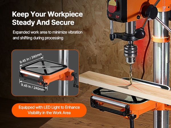 Paksusta metallista valmistettu työpöytä tarjoaa hyvän vakauden. Korkeuden ja 45° kulman säätö mahdollistavat työkappaleen tarkan asemoinnin ja helpottavat monimutkaisia poraustehtäviä.