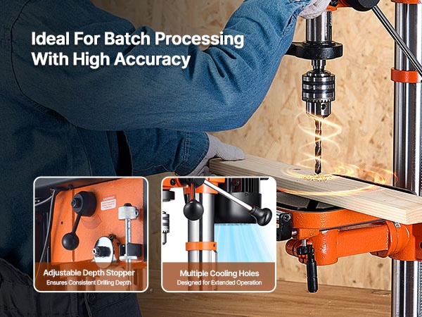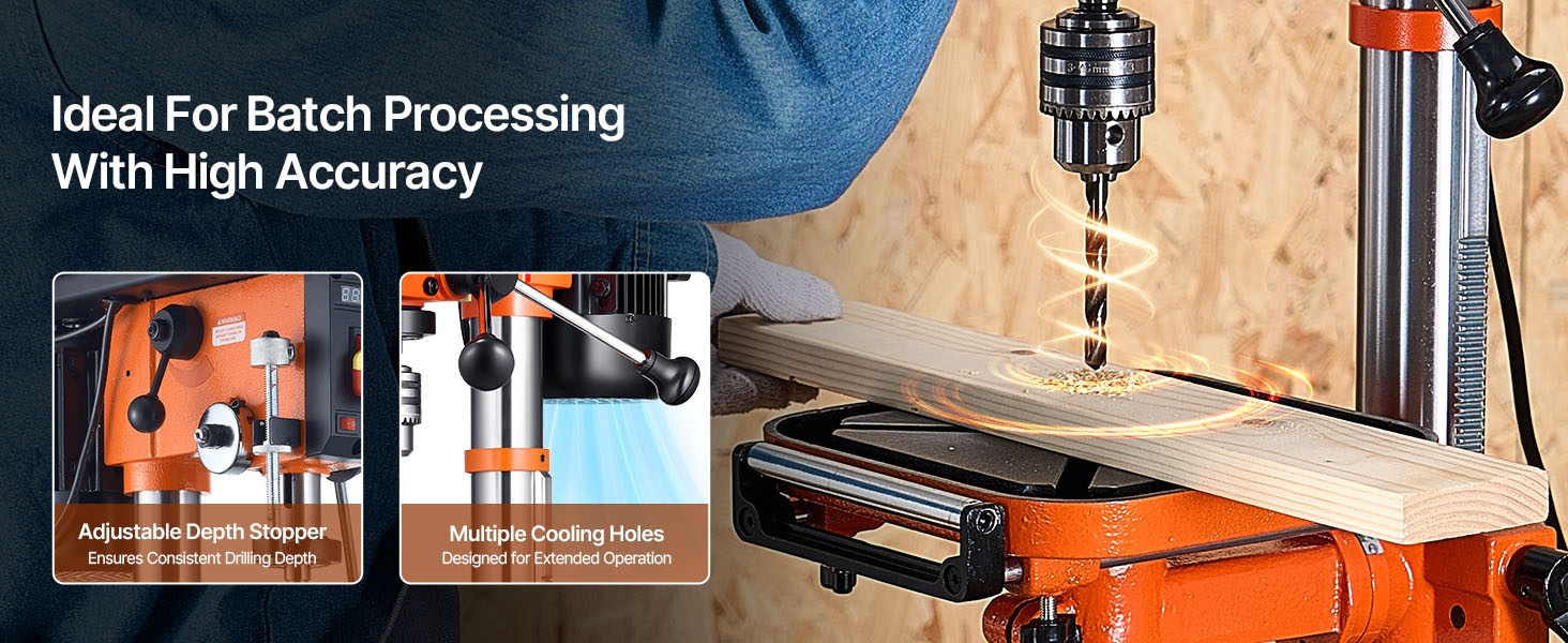 Allaskuparinen induktiomoottori ja portaattomasti säädettävä kierrosnopeus 340–2200 RPM mahdollistavat tehokkaan porauksen puuhun, metalliin ja muihin materiaaleihin. X-ray-positiointi auttaa kohdistamaan poranterän tarkasti, LED-valo parantaa näkyvyyttä ja 0–45° kallistettava työpöytä helpottaa vaativia poraustöitä.
