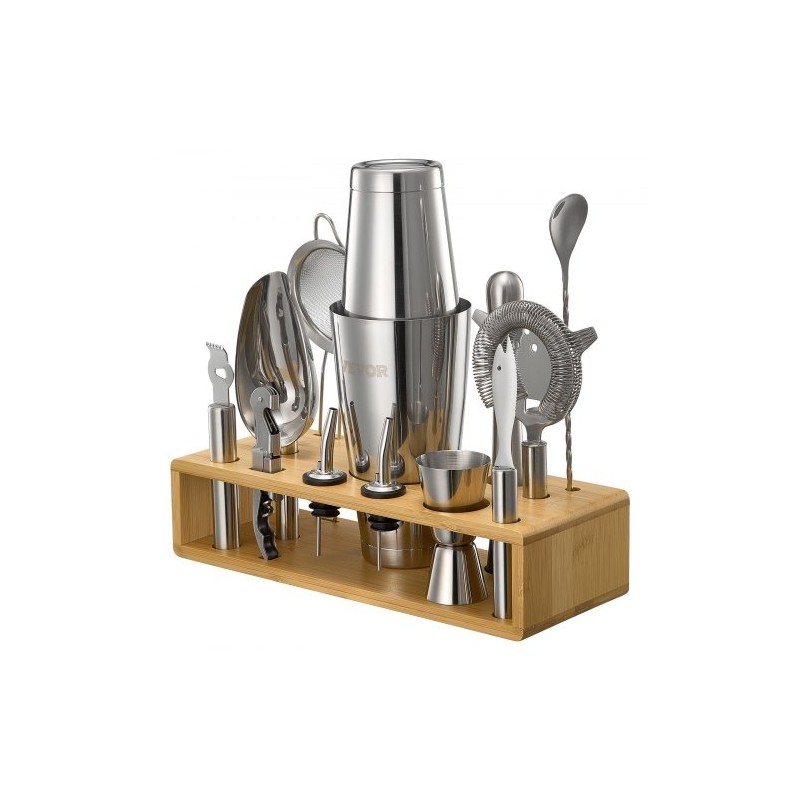 Tämä 13-osainen cocktail-setti sisältää kaikki perusvälineet herkullisten juomien valmistamiseen kotona. Ruostumattomasta teräksestä valmistetut baarityökalut ja bambuteline pitävät välineet siististi järjestyksessä ja helposti käden ulottuvilla.