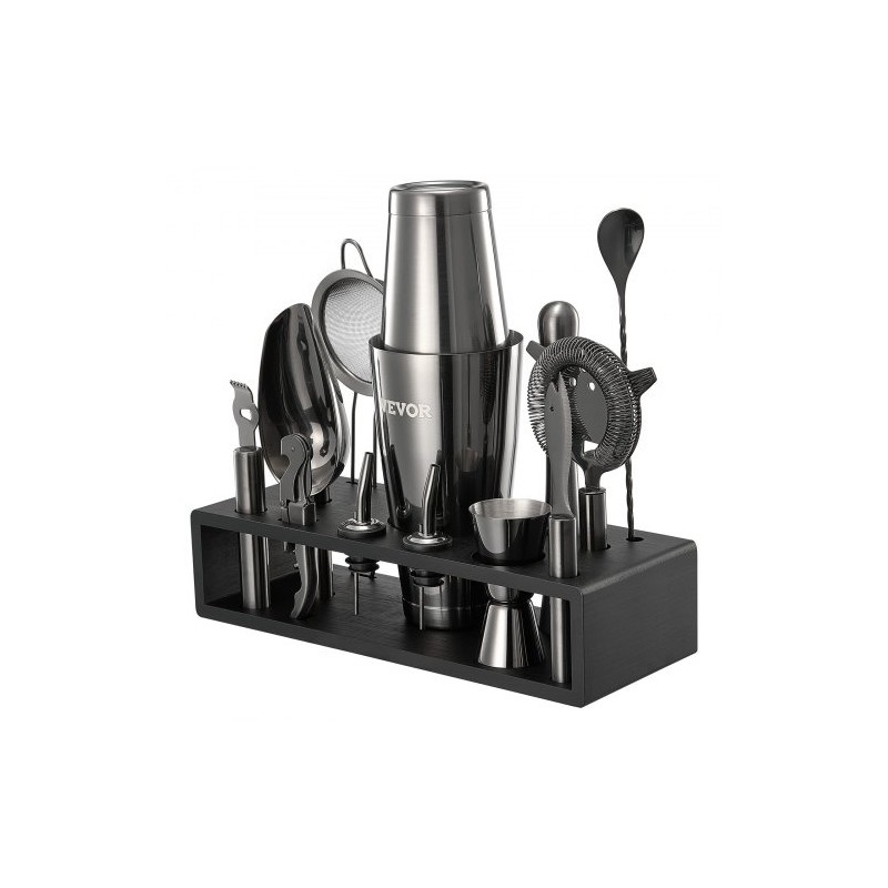 - 13-osainen setti: shakeri, lusikka, muddler, mitta, siivilä, kaatimet, jääkauha, sitrusraastin ja muuta.