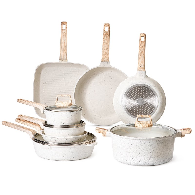 19-osainen valkoinen graniittipinnoitettu kattila- ja paistinpannasarja induktiolle karkaistuilla lasikansilla