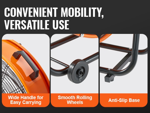 Jalustan juoksupyörät tekevät puhaltimen siirtämisestä vaivatonta, joten se voidaan mukauttaa nopeasti eri käyttökohteisiin. Pitkä virtajohto mahdollistaa joustavan sijoittelun ilman, että pistorasian sijainti rajoittaa käyttöä.