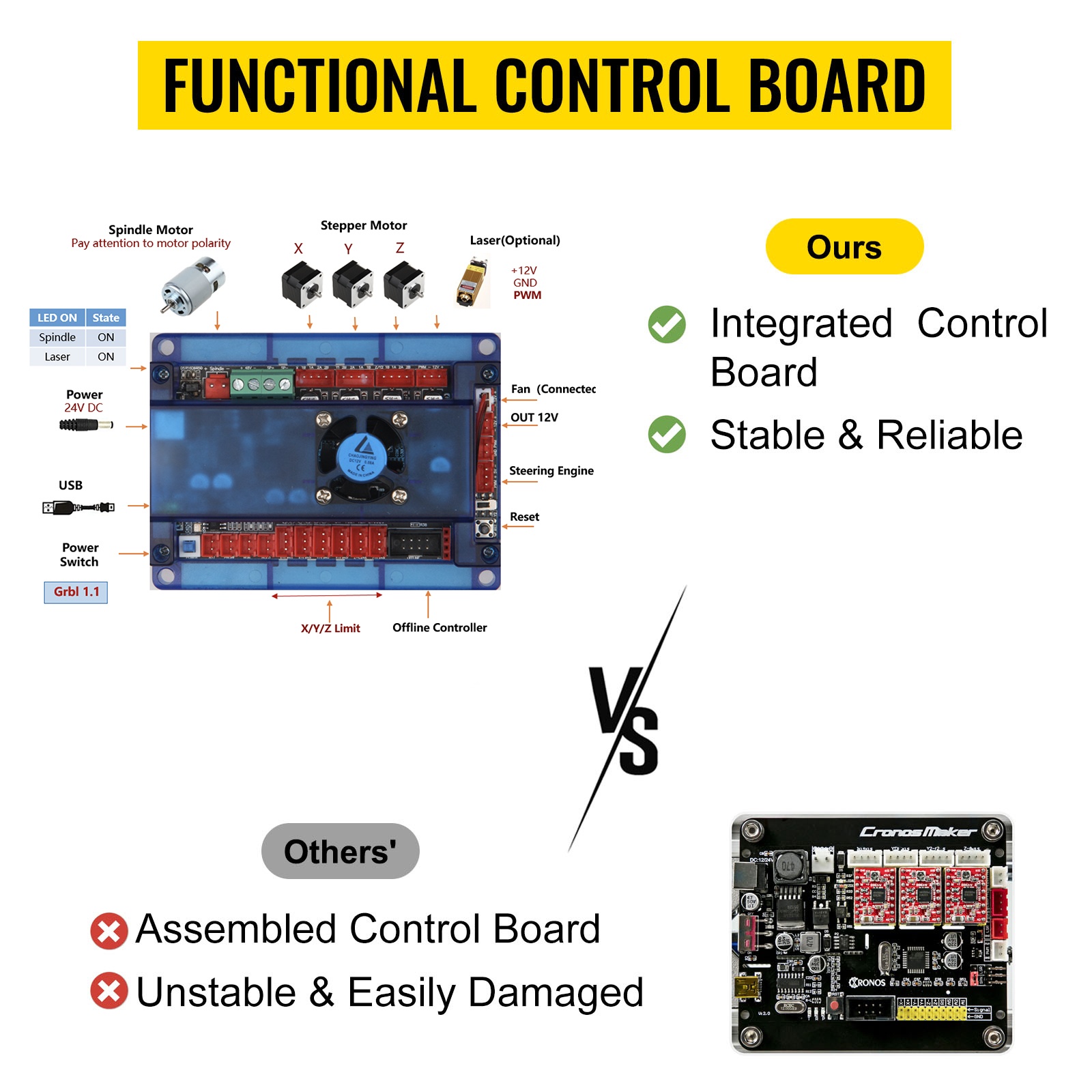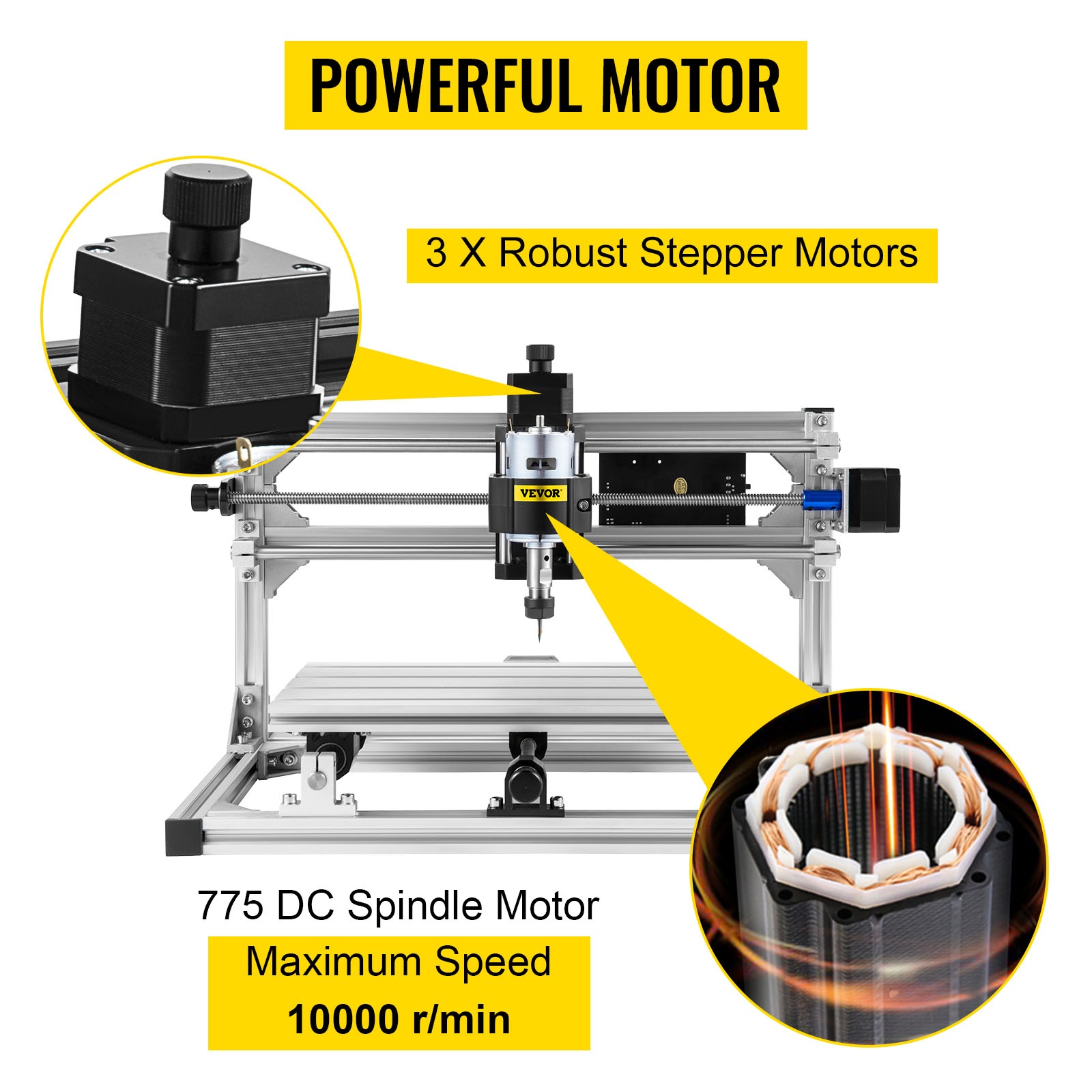 Kaikilla kolmella akselilla on omat askelmoottorinsa tasaisen liikkeen takaamiseksi. Z-akselilla oleva 775 DC(12-24V)24V -karamoottori yltää jopa 10000 rpm -kierrosnopeuteen, mikä sopii useimpiin pienten osien kaiverrus- ja jyrsintätöihin.