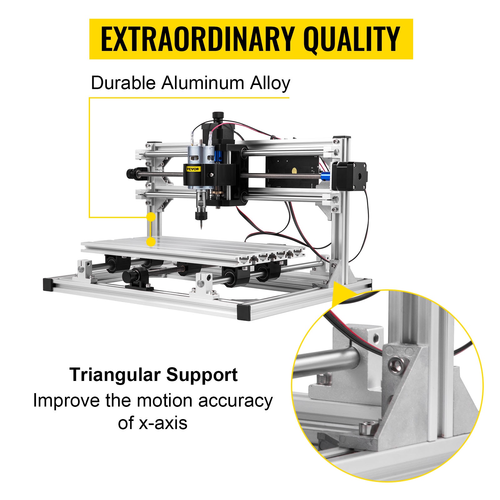 CNC 3018 PRO -runko on valmistettu alumiiniseoksesta, mikä parantaa jäykkyyttä ja mittatarkkuutta. Ruostumattomat teräsruuvit toimivat liikkeen siirtävinä osina ja tukevat tasaisia liikkeitä.