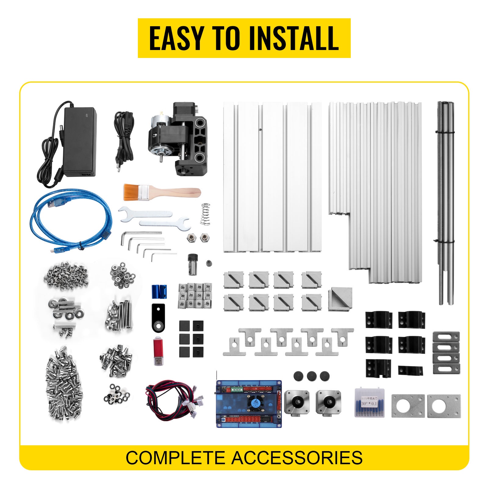 Pakkaus sisältää käyttöohjeen ja kokoamisohjeet, joiden avulla kone saadaan koottua vaihe vaiheelta. Ohjeita seuraamalla saat laitteen käyttövalmiiksi ilman aiempaa CNC-kokemusta.