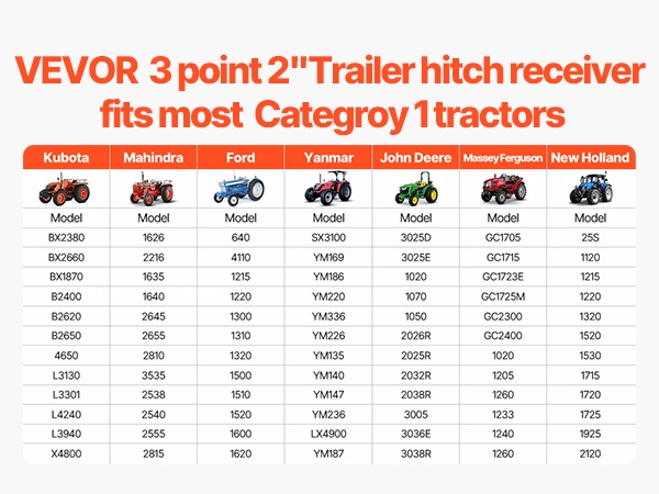 3-pisteen vetolaite sopii useisiin kompaktitraktoreihin, kuten Kubota, Mahindra, Ford, Yanmar, John Deere ja Massey Ferguson. Helppo kytkentä vähentää yhteensopivuusongelmia ja sujuvoittaa työlaitteiden käyttöä.