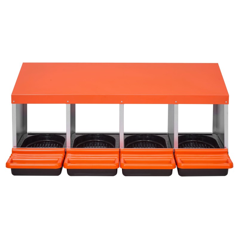Tämä 4-osastoinen metallinen kanalapylly tarjoaa mukavan ja ilmavan pesäpaikan erilaisille kananroduille. Kallistettu pesärakenne ohjaa munat hellävaraisesti keräysalueelle, helpottaa keräystä ja auttaa pitämään munat puhtaampina.