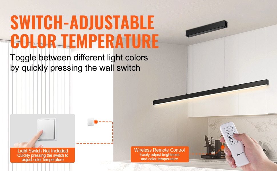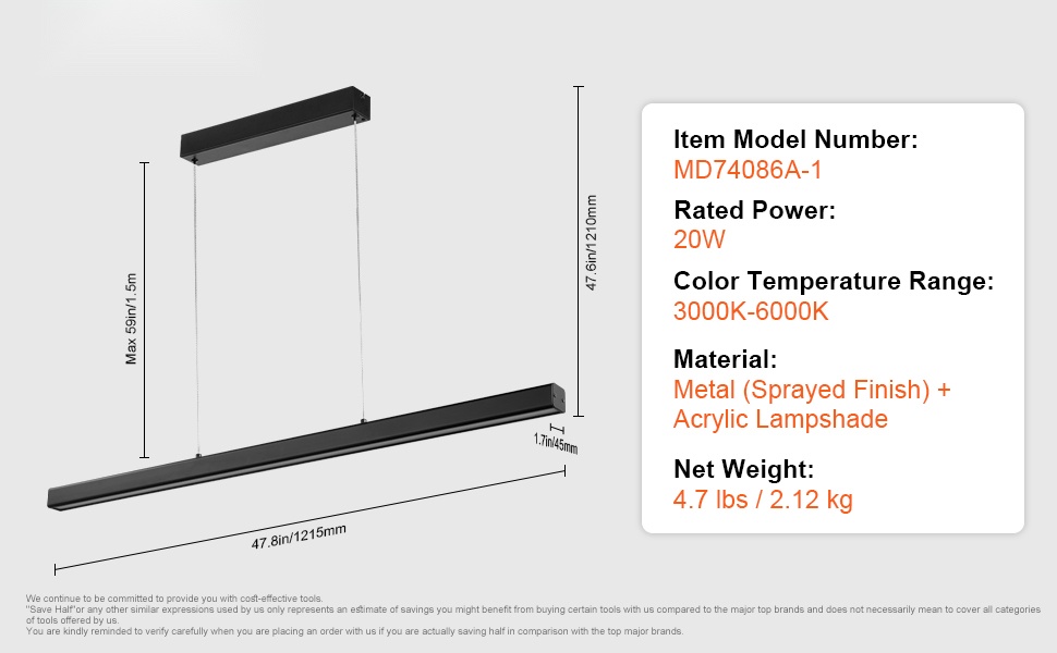 Valaisin toimitetaan yhteensä 8 tangon kanssa (2 x 6-tuumainen ja 6 x 12-tuumainen), joiden avulla valaisimen korkeutta voidaan säätää helposti erikorkuisiin kattoihin. Näin saat valon sijoitettua sopivalle tasolle keittiösaarekkeen, baaritason tai ruokapöydän yläpuolelle.