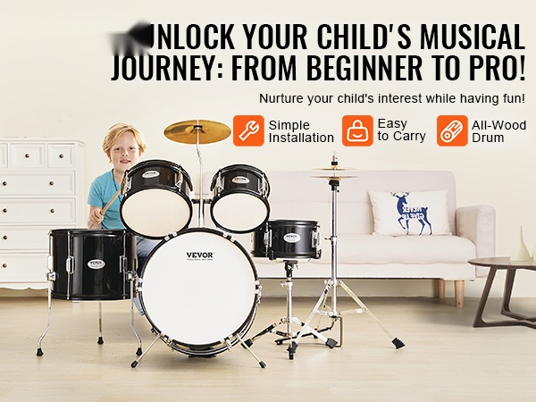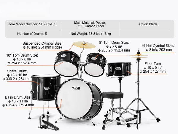 Setti sisältää bassorummun, tomit, virvelin ja lattiatomin lisäksi telineet, hi-hatin, symbaalin, polkimet, säätökelpoisen rumpujakkaran ja rumpukapulat, joten voit aloittaa harjoittelun heti kokoamalla setin.