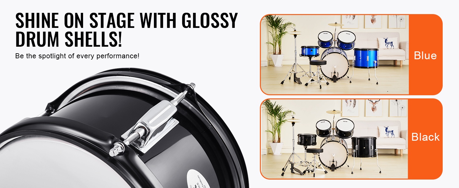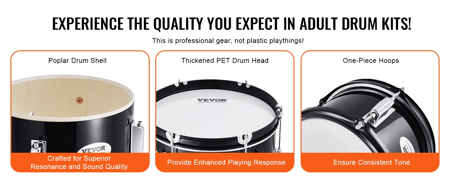 Tämä täysikokoinen rumpusetti sisältää 10'' tom-tomin, 12'' tom-tomin, 14'' virvelirummun, 22'' bassorummun ja 16'' lattiatomin. Poppelista valmistettu rumpukuori ja kestävä PET-kalvo tuottavat selkeän, dynaamisen ja tasapainoisen soinnin harjoitteluun ja esiintymiseen.