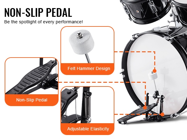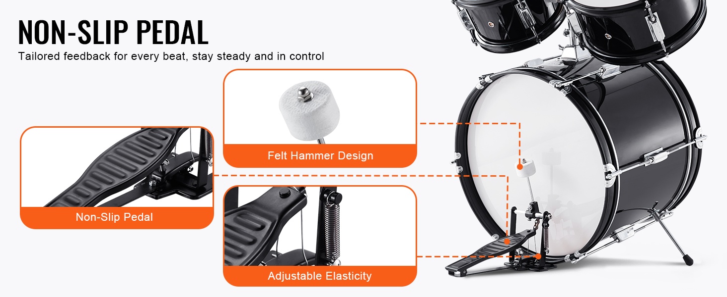 Vahvistettu teräsrunko ja paksunnetut telineet pitävät rummut tukevasti paikallaan. Vakaa bassorummun poljin vähentää ei-toivottua liikettä ja auttaa keskittymään soittoon.