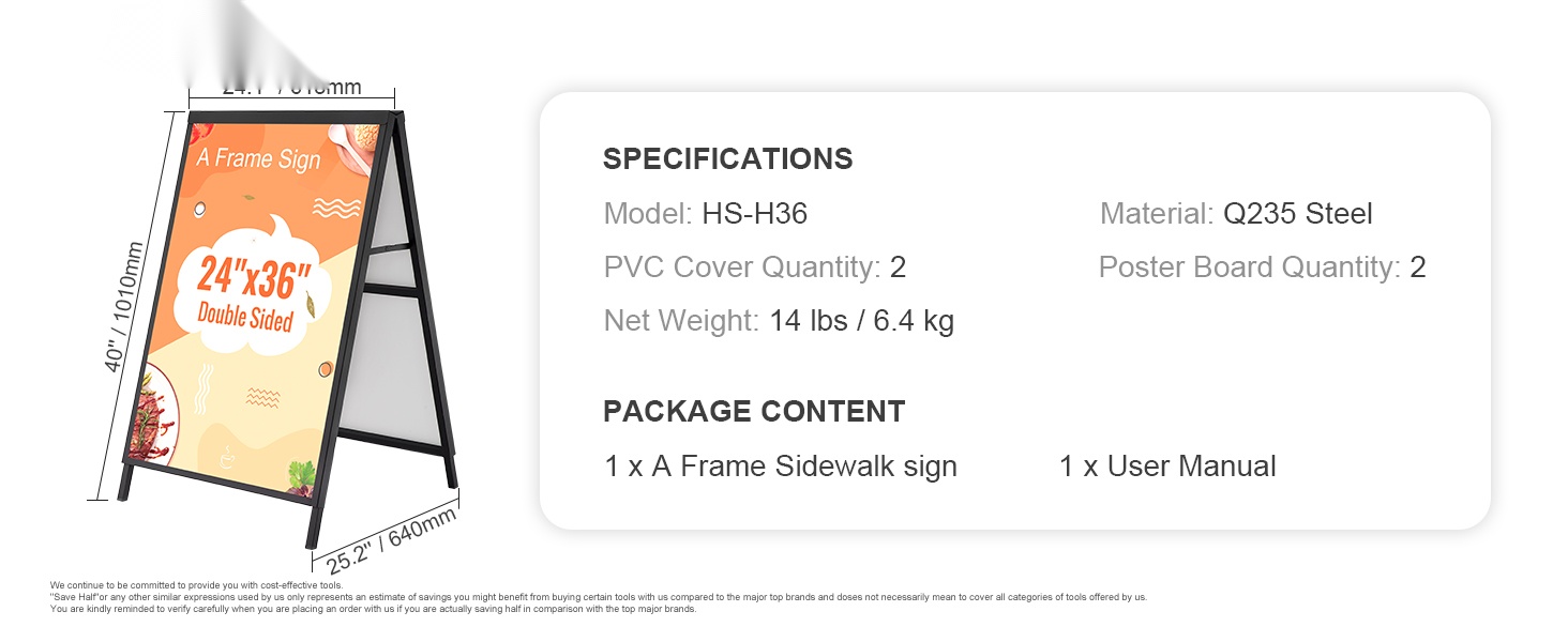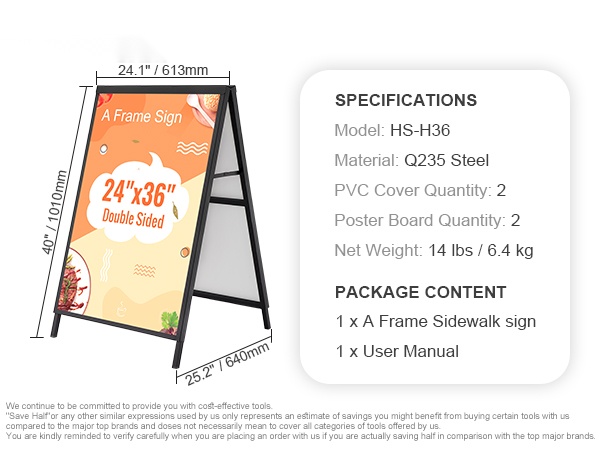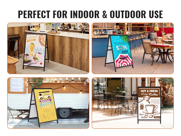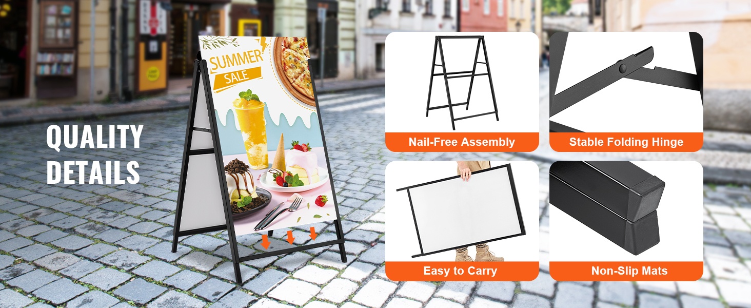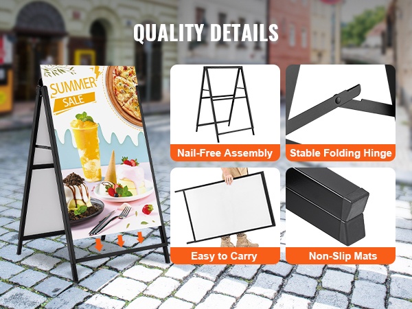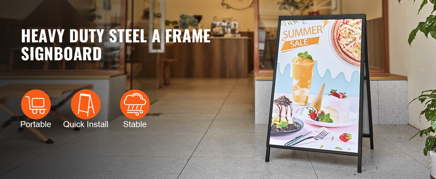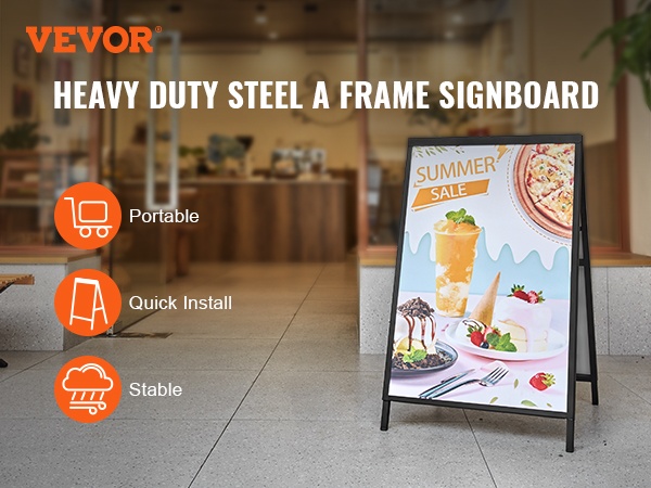 A-mallinen jalkakäytäväkyltti, johon sopii 24x36-tuumainen juliste. Teline avataan vain auki ja juliste liu'utetaan paikoilleen kaksipuoleiseen kehykseen. Musta pinnoite korostaa mainoksesi näkyvyyttä, ja paksusta Q235-teräksestä valmistettu runko kestää hyvin ulkokäyttöä eri ympäristöissä.