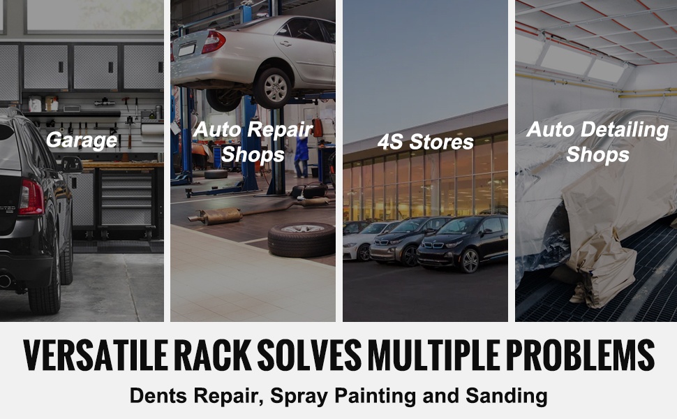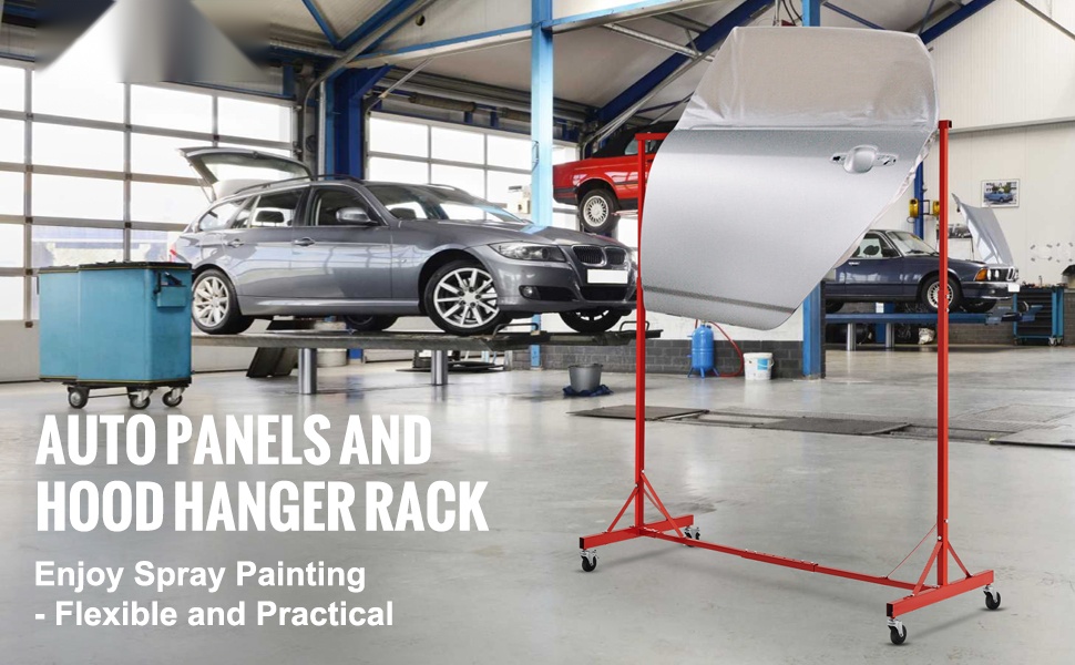 Tämä säädettävä maalausteline helpottaa ovien, puskurien ja muiden osien maalausta ja kuivattamista. Korkeutta ja leveyttä voi säätää työn mukaan, ja tukeva teräsrakenne yhdistettynä pyöriviin pyöriin tekee telineestä helposti liikuteltavan myös kuormattuna.