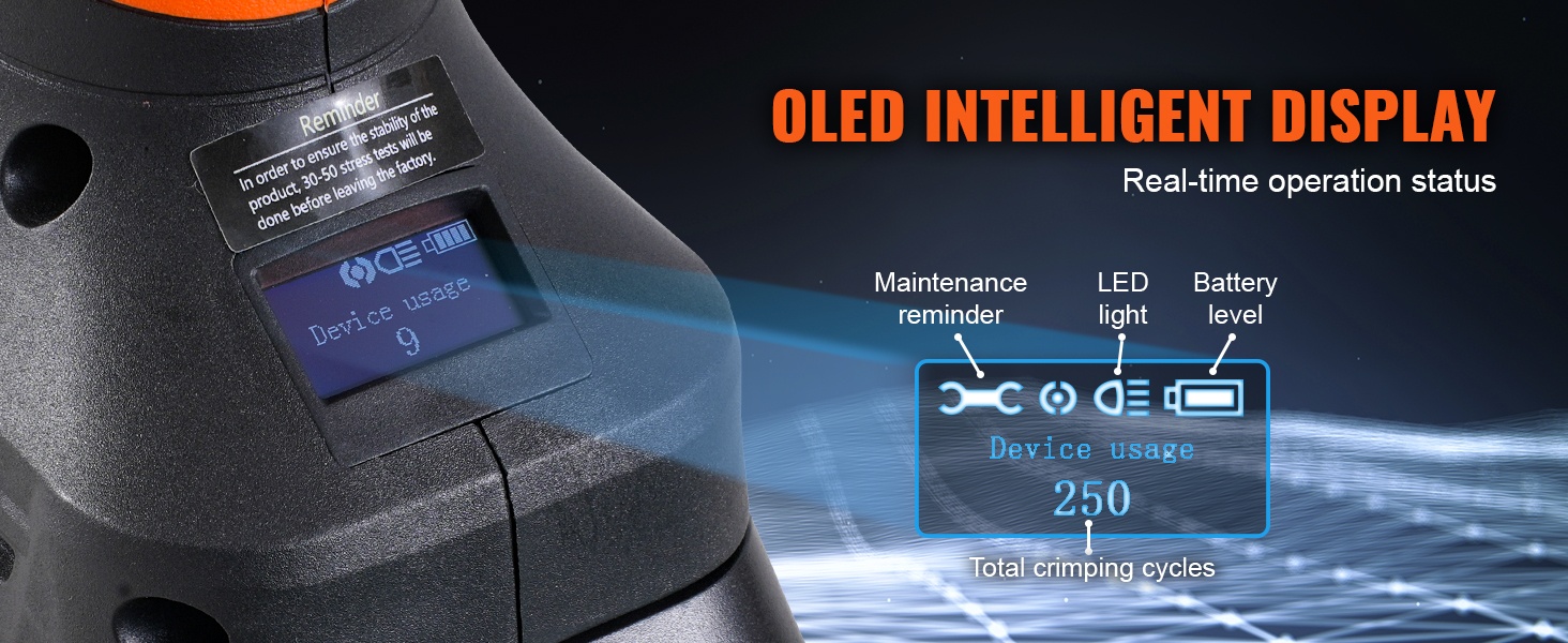 - OLED-näyttö näyttää akun tason, työtilan ja puristustiedot reaaliaikaisesti.