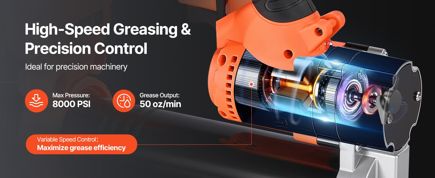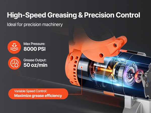 Enintään 8000 PSI:n paine ja suuri virtaus tekevät voitelusta vaivatonta. Säädettävä liipaisin antaa mahdollisuuden hallita rasvan määrää tarkasti, mikä sopii herkille koneenosille ja auttaa vähentämään materiaalihukkaa.