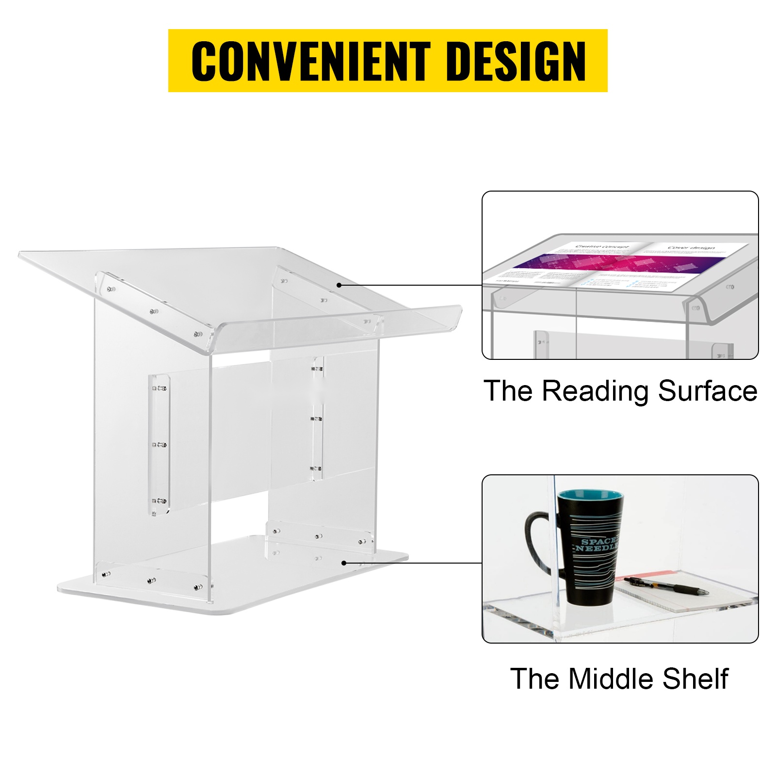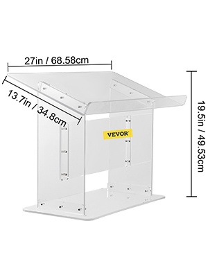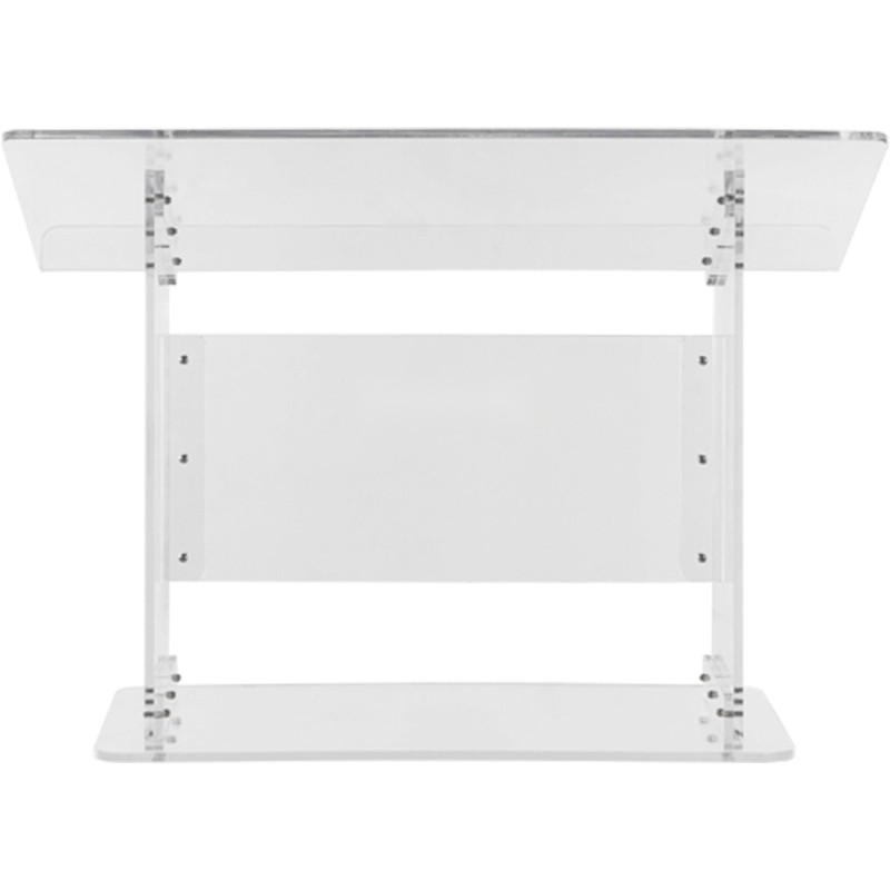 Tämä 19.5"/49.53 cm korkea pöytämallinen akryylipuhujapöytä nostaa kirjat ja muistiinpanot sopivalle korkeudelle seisten pidettäviä puheita varten. Läpinäkyvä akryyli antaa kevyen ja modernin ilmeen, ja viistolle tasolle integroitu kirjatuki estää papereita liukumasta. Puhujapöytä on irrotettava, joten se on helppo koota, purkaa ja säilyttää pienessä tilassa.