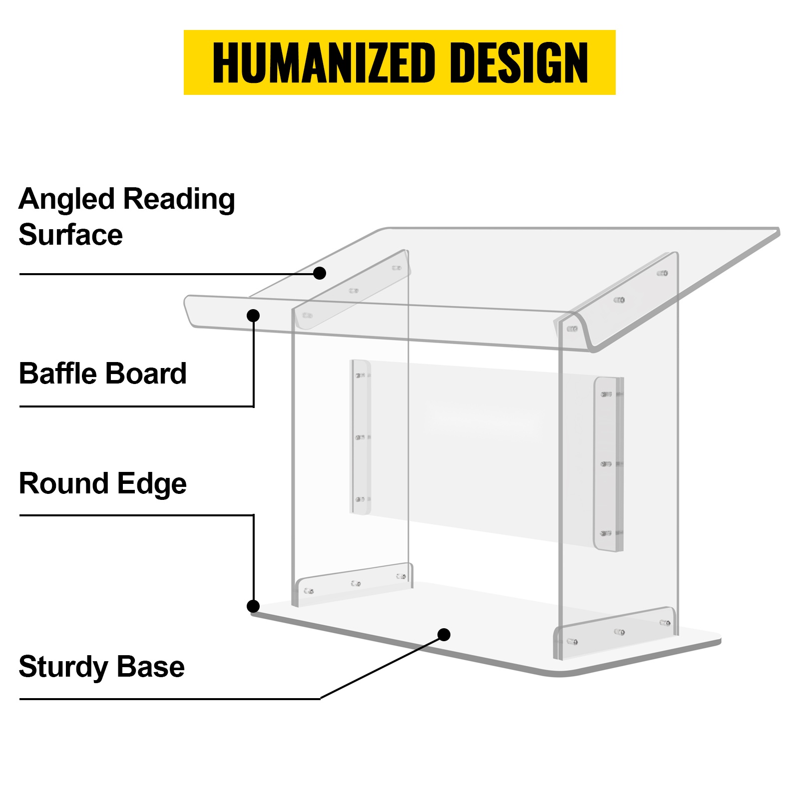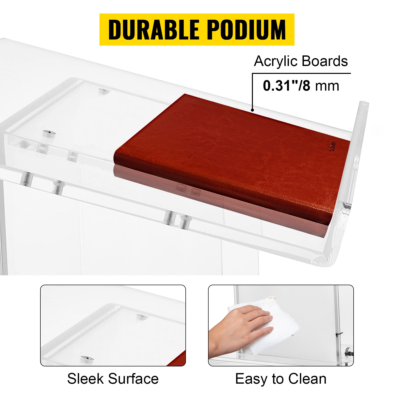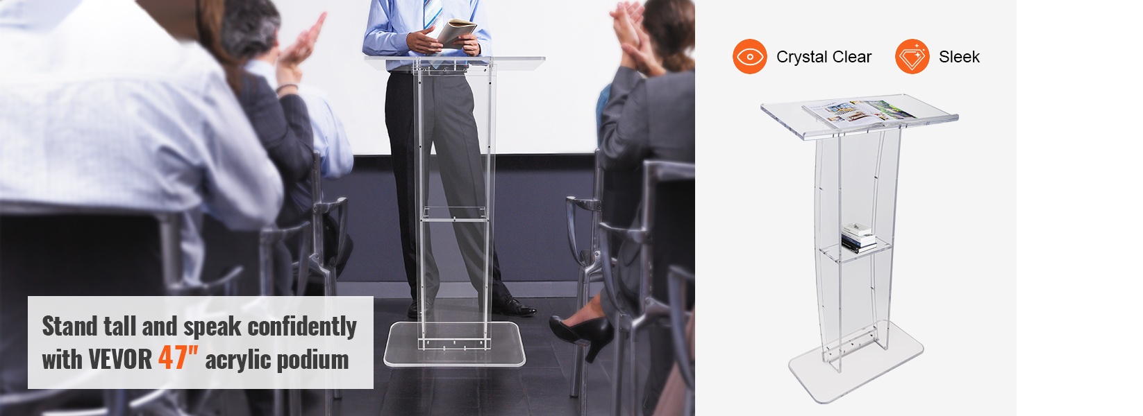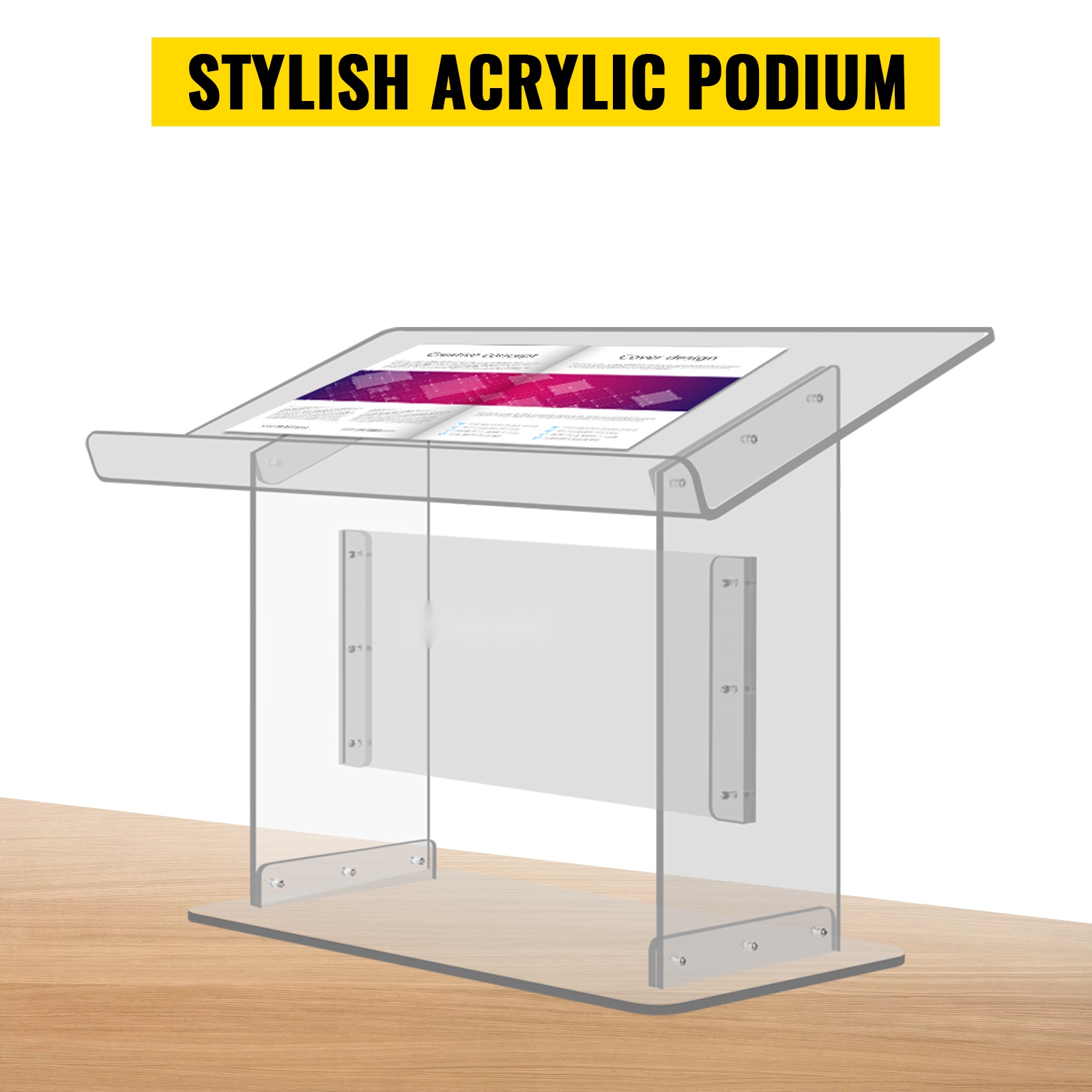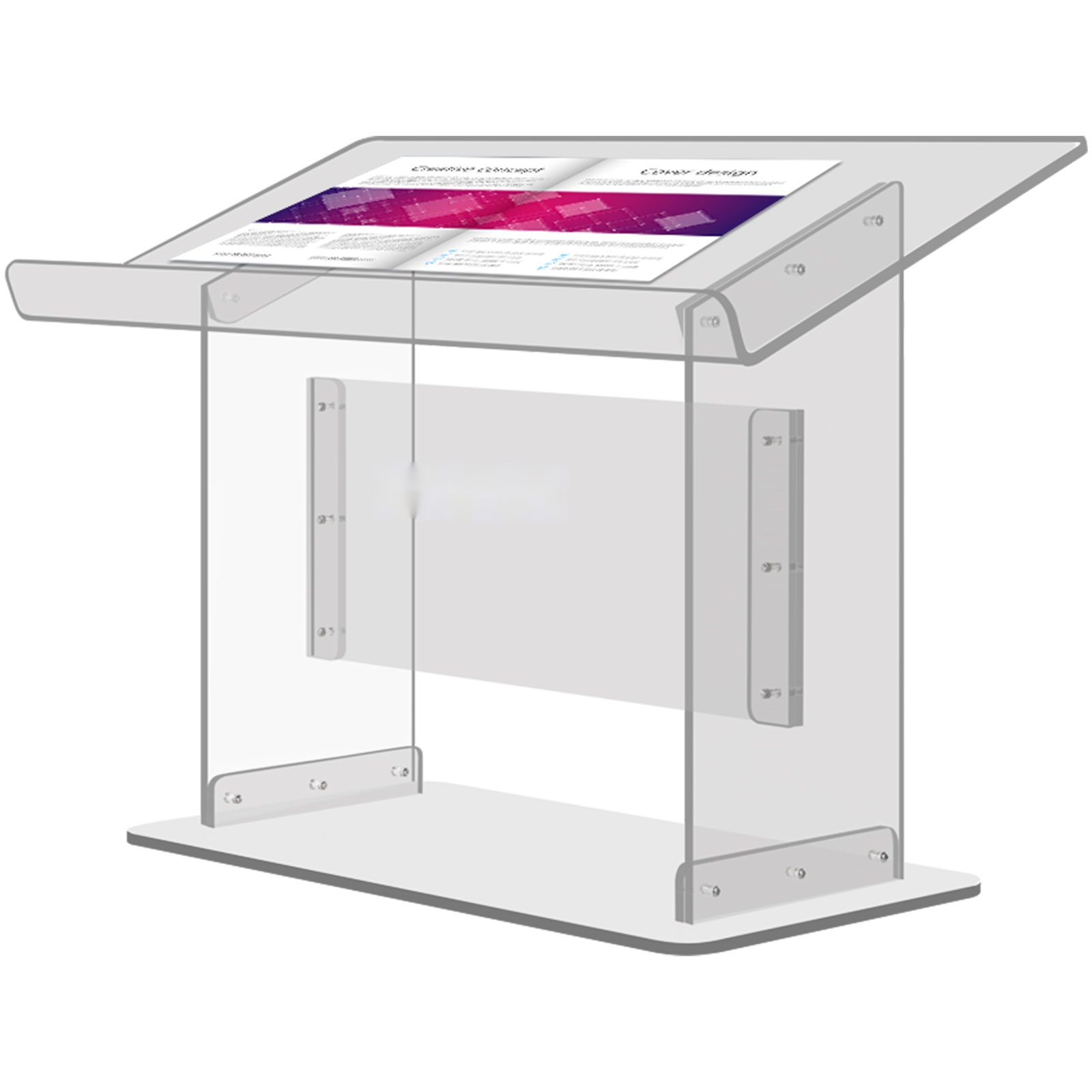Läpinäkyvä puhujapöytä on valmistettu paksusta akryylistä, joka on tukeva ja iskunkestävä. Ylälevyn paksuus on 0.31"/8 mm ja sivulevyjen paksuus 0.59"/15 mm, mikä parantaa kokonaisuuden vakautta ja käyttöikää.