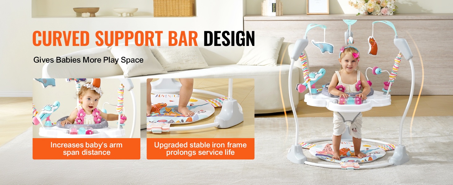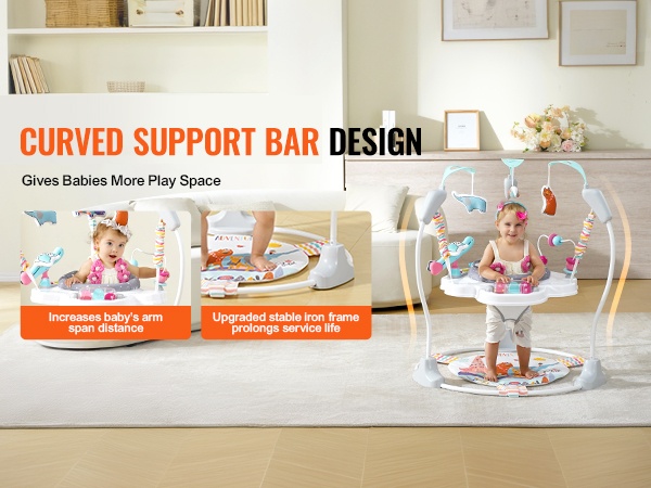 Kaareva runkorakenne antaa lapselle tavallista enemmän tilaa liikkua ja leikkiä. Vahvistettu alaosa tekee keskuksesta vakaamman, ja joustava pompputoiminto tarjoaa vauvalle paljon liikehdintää ja aktiviteetteja.