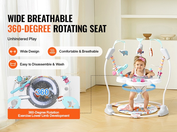 360 astetta pyörivä istuin tekee jokaisesta suunnasta kiinnostavan. Lapsi voi kääntyä helposti eri lelujen ja äänten suuntaan, jolloin ympäristön tutkiminen on luontevaa ja vaihtelevaa.