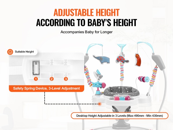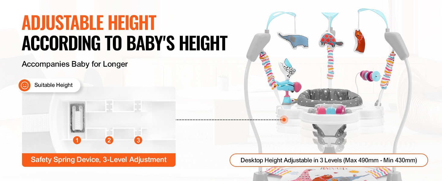 Kolme säädettävää korkeustasoa mukautuvat lapsen kasvuun. Vauva voi harjoitella liikkumista ja kehonhallintaa samalla, kun leikki ja tekeminen pysyvät mieluisina eri ikävaiheissa.