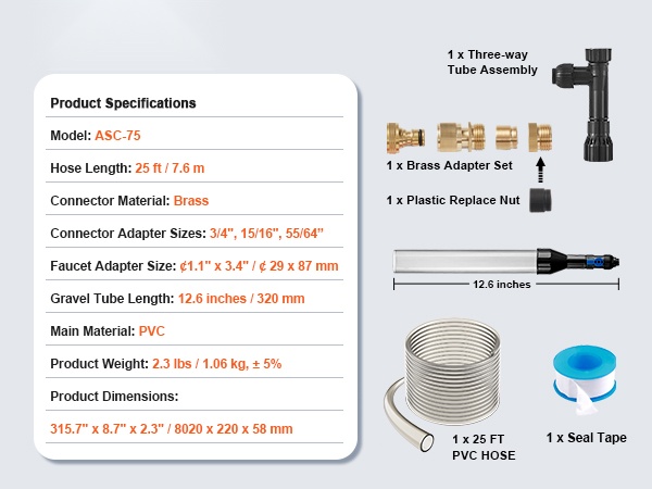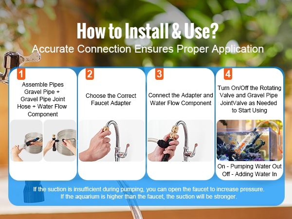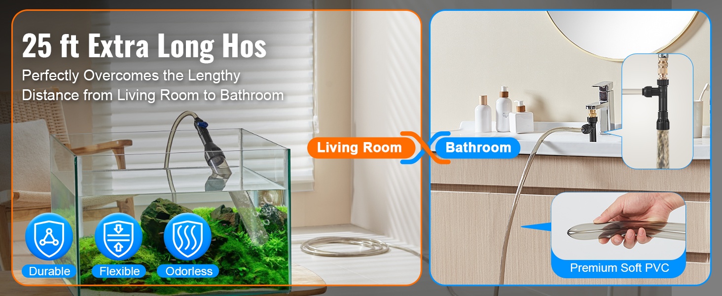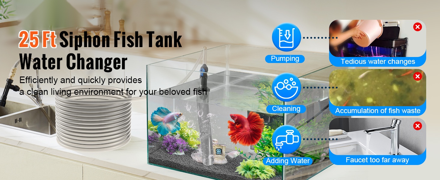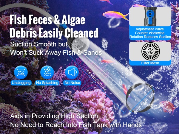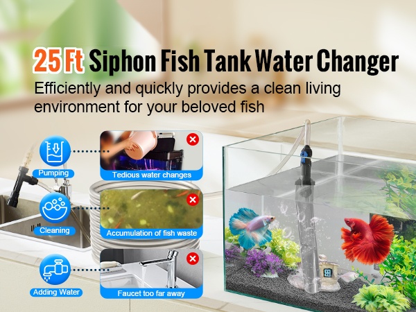 Laite hyödyntää vedenpaine-eroa akvaarion veden pumppaamiseen ja puhdistamiseen. Säädä venttiiliä lisätäksesi tai poistaaksesi vettä ja hoida näin tehokkaat, puoliksi automaattiset vedenvaihdot.