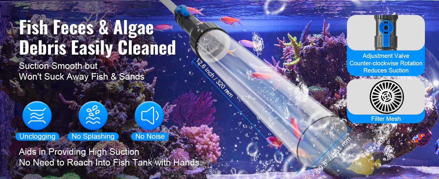 Tällä akvaarion imurilla ja soran puhdistajalla teet vedenvaihdot ja pohjan puhdistuksen nopeasti ilman sähköä. Laite hyödyntää vedenpaine-eroa pumppaamiseen ja puhdistamiseen, ja venttiiliä säätämällä voit lisätä tai poistaa vettä hallitusti.