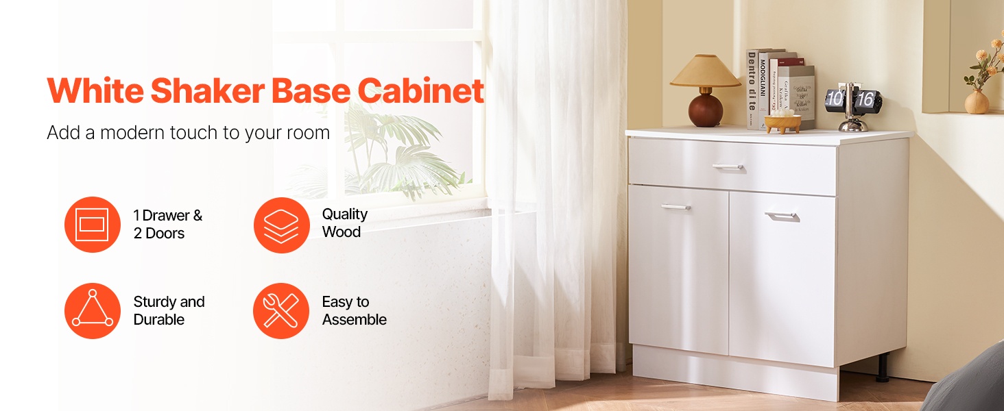 Valkoinen shaker-tyylinen alakaappi laatikolla tuo lisää säilytystilaa kotiin tai toimistoon. Kestävä rakenne, pehmeästi sulkeutuvat ovet ja laatikko sekä säädettävä hylly tekevät kaapista käytännöllisen valinnan monenlaisiin tiloihin.