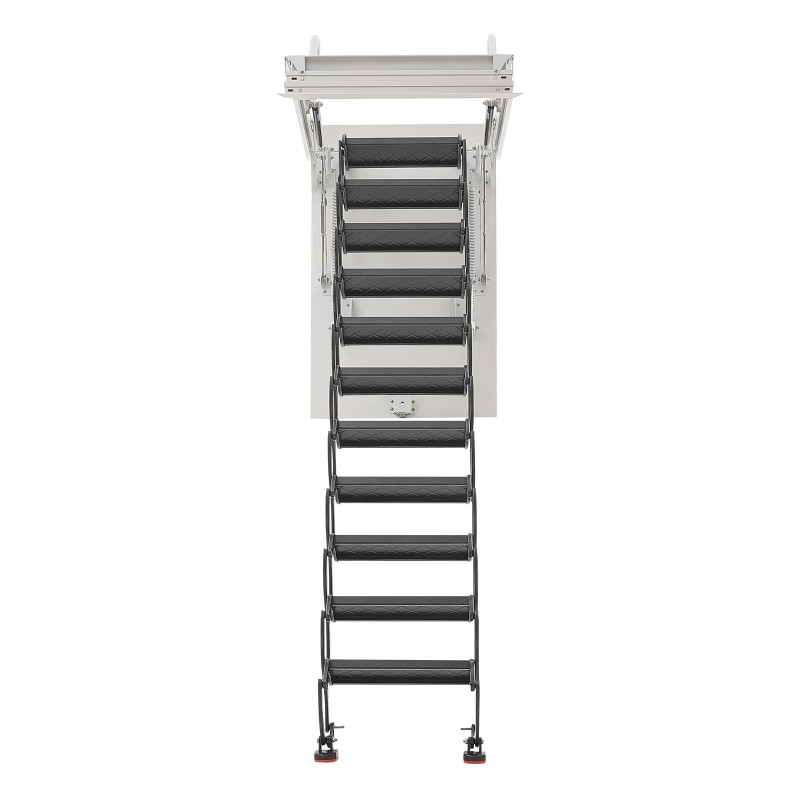 Alasvedettävä ullakkotikkaat helpottavat pääsyä ullakolle tai parvelle ja säästävät tilaa, kun niitä ei käytetä. Tikkaat sopivat 8.5–9.4 jalan (2.6–2.85 m) huonekorkeudelle ja 39.4 x 27.5 tuuman (1000.76 x 698.5 mm) asennusaukkoon. Vankka teräs-, alumiini- ja puurakenne ja enintään 660 lbs / 299.4 kg kantavuus takaavat tukevan käytön koti- ja työympäristöissä.