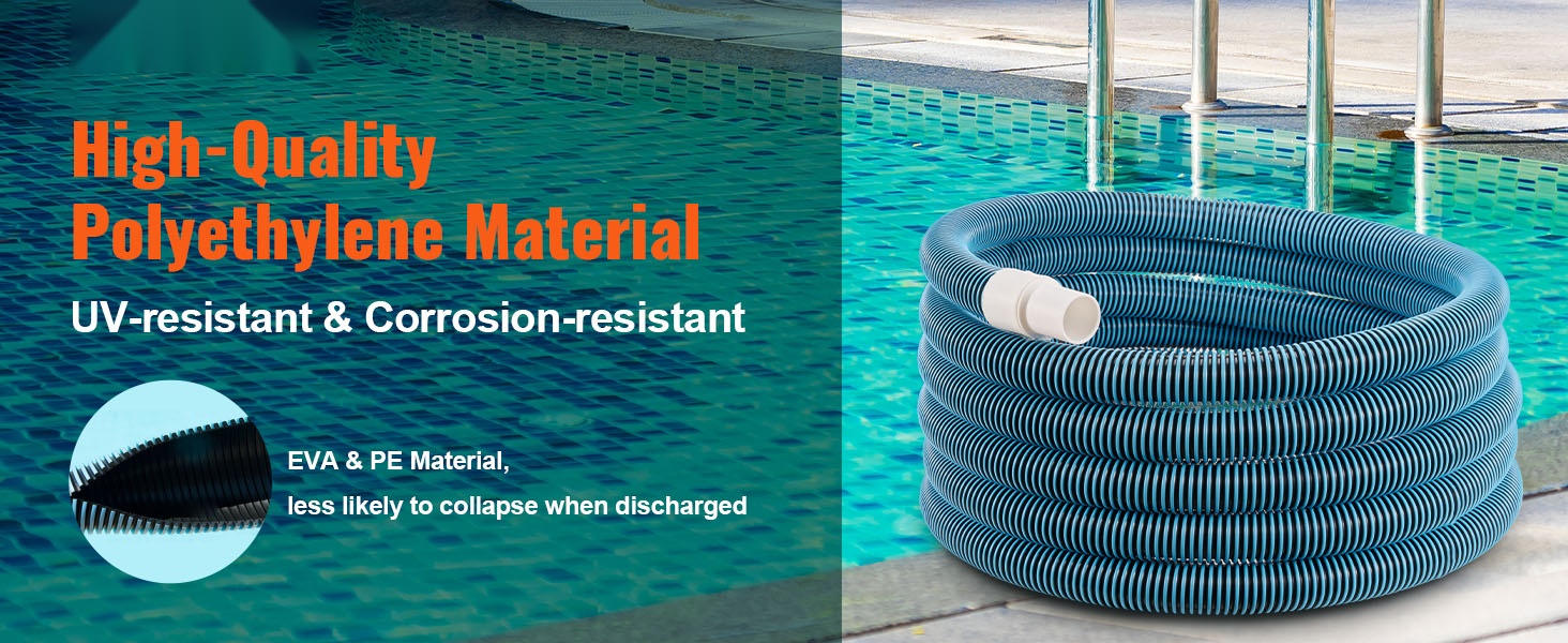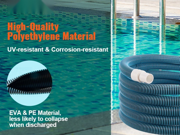 Tämä uima-altaan letku on valmistettu korkealaatuisesta polyeteenistä ja vahvistettu kaksinkertaisella rakenteella (EVA-materiaali + PE-materiaali). Materiaalit kestävät korroosiota ja niillä on suuri lujuus, joten letku ei helposti painu kasaan tyhjennyksen aikana ja sen käyttöikä on pitkä.