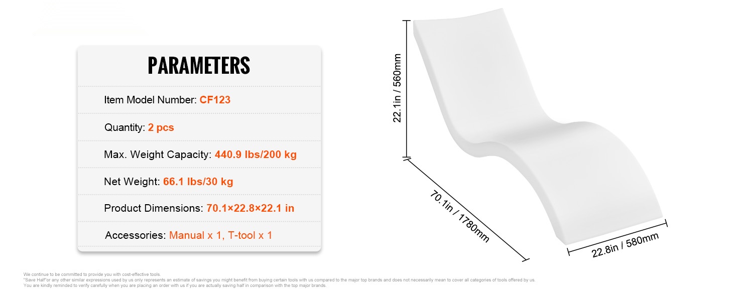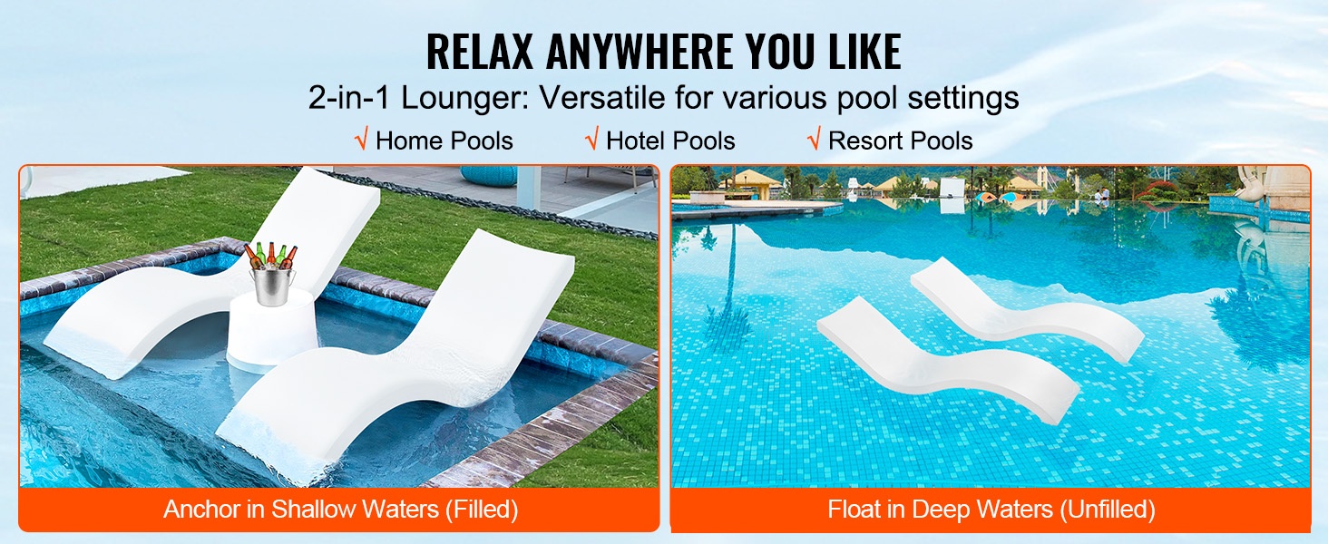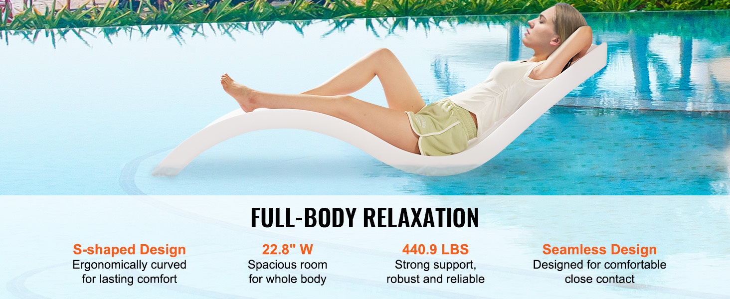 Ergonominen S-muotoinen rakenne mukautuu selän kaareen ja tarjoaa pitkäkestoista istumis- ja makuumukavuutta. Istuimen leveys on 22.8" ja kantavuus 440.9 lbs/200 kg, joten tuolissa on hyvin tilaa erilaisille käyttäjille ja se tekee vedessä rentoutumisesta miellyttävää.