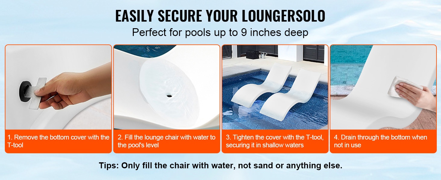 Altaassa käytettävä lepotuoli on helppo täyttää vedellä irrottamalla pohjassa oleva korkki tai käyttämällä puutarhaletkua. Täytön jälkeen tuoli pysyy vakaasti paikallaan. Kun tuoli ei ole käytössä, vesi voidaan tyhjentää, jolloin se kuivuu ja pysyy puhtaana, mikä pidentää käyttöikää.