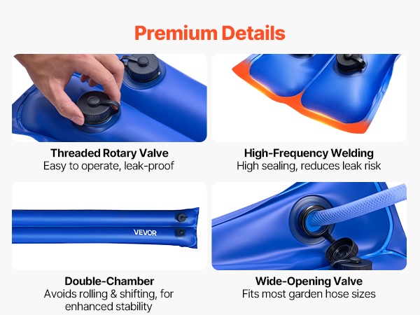 Jokaisessa pussissa on integroitu kierreventtiili, joka helpottaa täyttöä ja tyhjennystä ja auttaa estämään vuotoja. Levennetty täyttöaukko sopii useimpiin puutarhaletkuihin, ja 0.59 tuuman lämpöhitsatut saumat varmistavat pitävän tiivistyksen. Kaksikammioinen rakenne estää pussien pyörimistä ja parantaa vakautta tuulisella säällä.