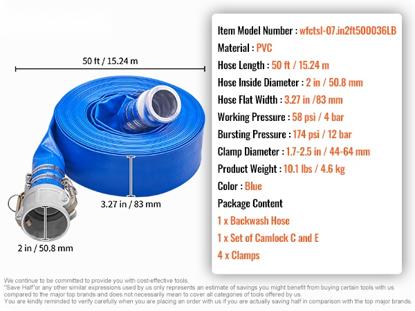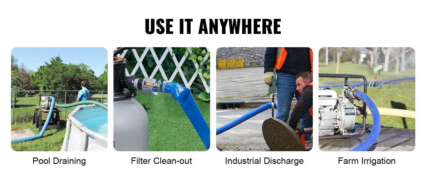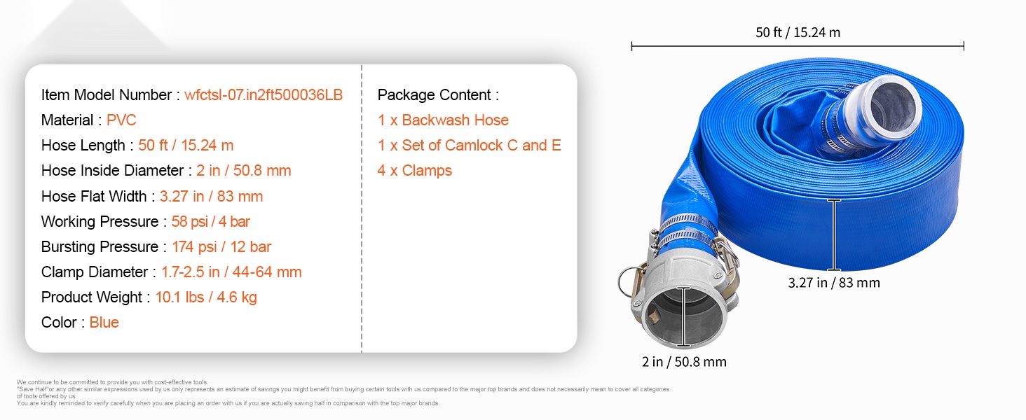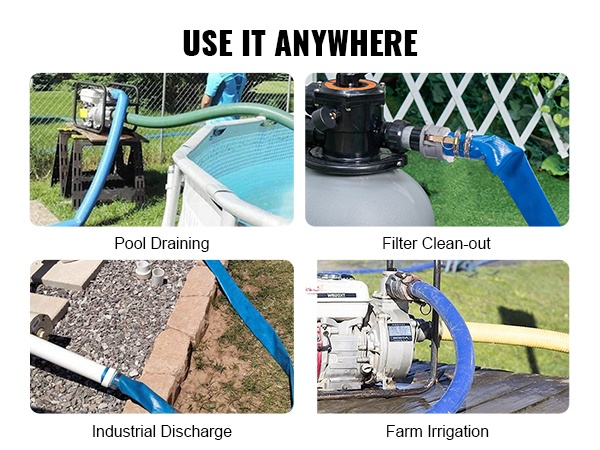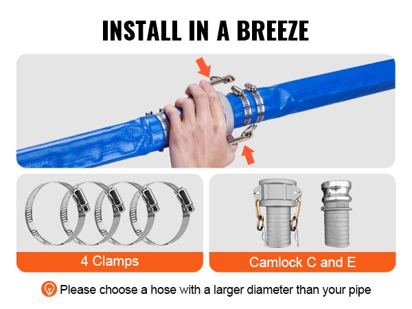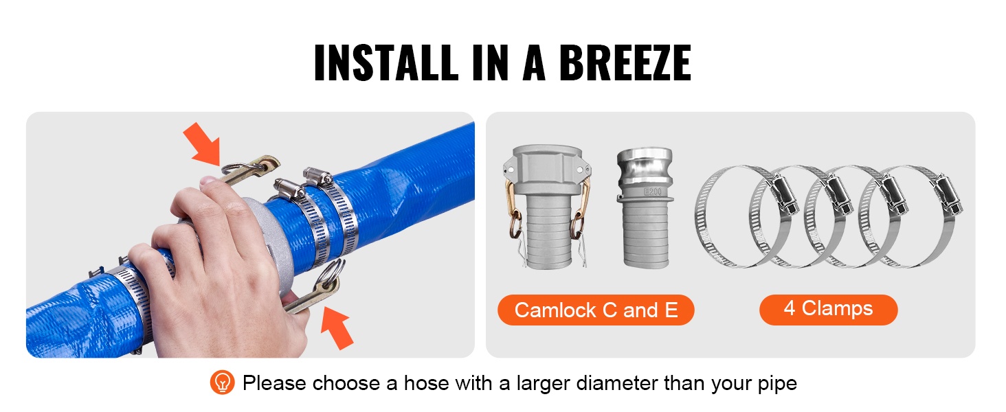 Mukana tulevat alumiiniset camlock C- ja E-liittimet sekä 4 letkukiristintä helpottavat asennusta. Letku on yhteensopiva 1-1/2 tuuman vesiputkien kanssa, ja tiivis liitos auttaa ehkäisemään vuotoja.