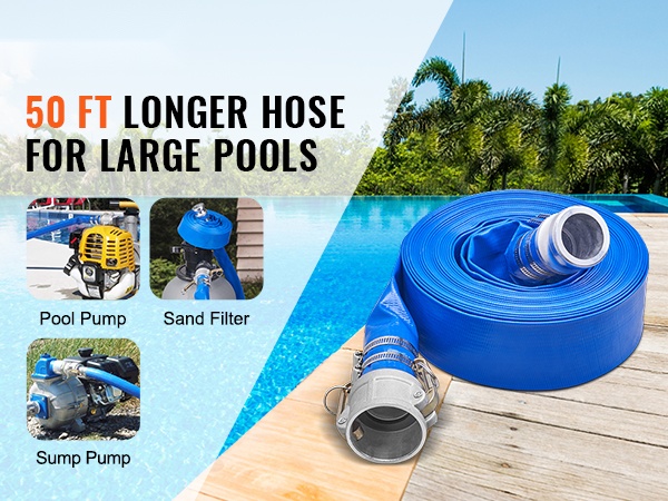 Tällä 2 tuuman halkaisijalla ja 50 ft/15.24 m pituudella varustetulla huuhteluletkulla altaan puhdistus sujuu vaivattomasti. Pitkä letku sopii sekä pienempiin että suurempiin altaisiin ja muuhun vedenpoistoon.