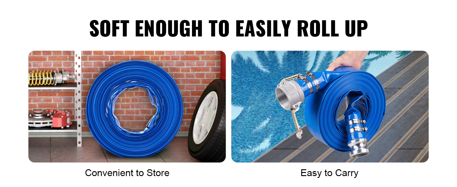 Kun työ on tehty, litteäksi painettava letku voidaan rullata kompaktiksi paketiksi. Se vie vain vähän tilaa hyllyllä tai varastossa ja on helppo ottaa mukaan eri työkohteisiin.