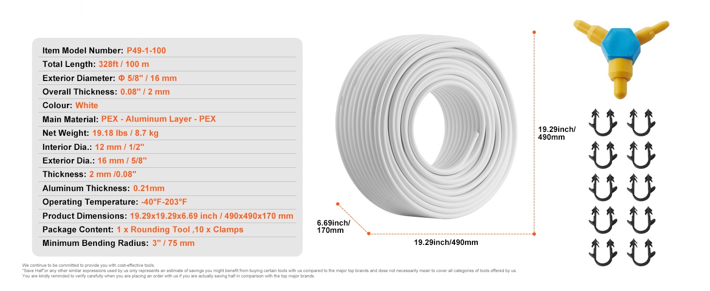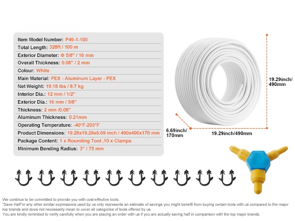 - Toimitussisältö: PEX-AL-PEX -putki, pyöristystyökalu, 30 kiinnikettä