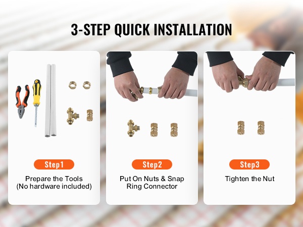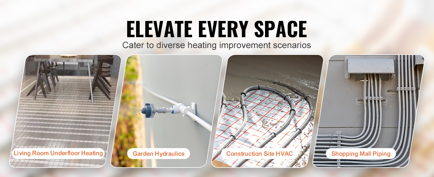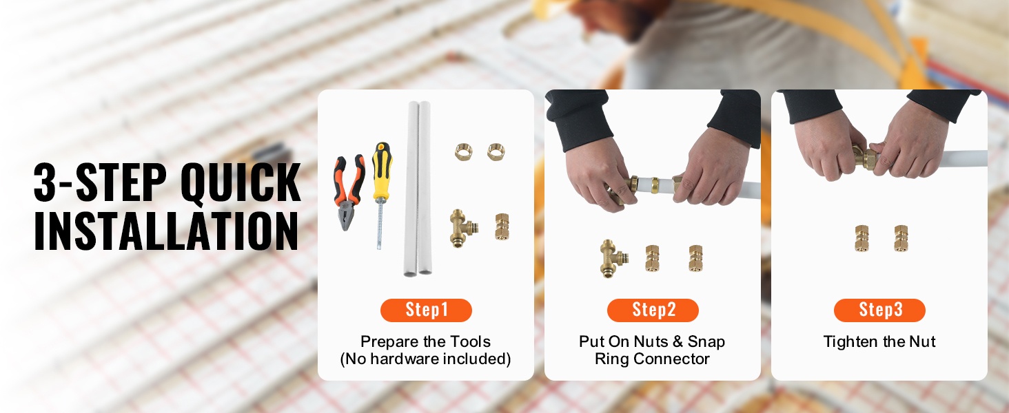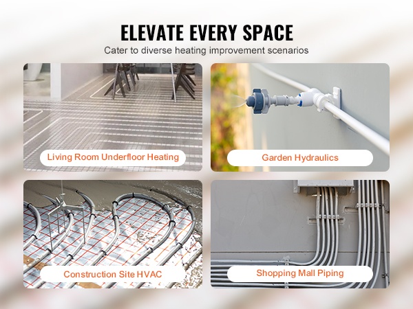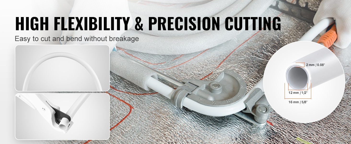 Pakkaukseen sisältyy täysi sarja asennustarvikkeita: pyöristystyökalu ja 30 kiinnikettä, jotka helpottavat putken katkaisua ja asennusta. Putki soveltuu useisiin liitinjärjestelmiin ja eri lattiatyypeille, kuten puulattioille, marmorille, betonille ja laatoille.