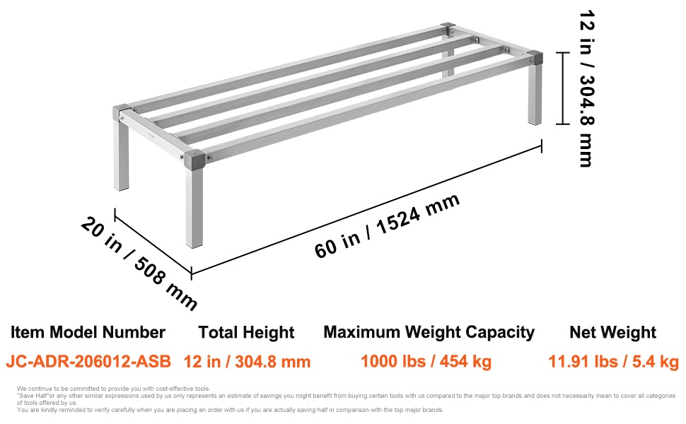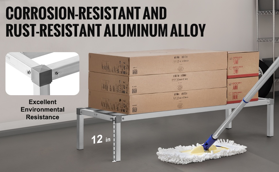 Alumiininen dunnage-hylly tarjoaa kestävän ja hygieenisen ratkaisun tavaroiden säilytykseen lattian yläpuolella. Hyllyn kantavuus on jopa 1000 lbs / 454 kg, joten se soveltuu hyvin keittiöihin, ravintoloihin, varastoihin, autotalloihin ja ajoneuvoihin. Korkeus lattiasta on 12 tuumaa / 304.8 mm, mikä helpottaa siivousta ja vähentää kosteuden vaikutusta säilytettäviin tavaroihin.