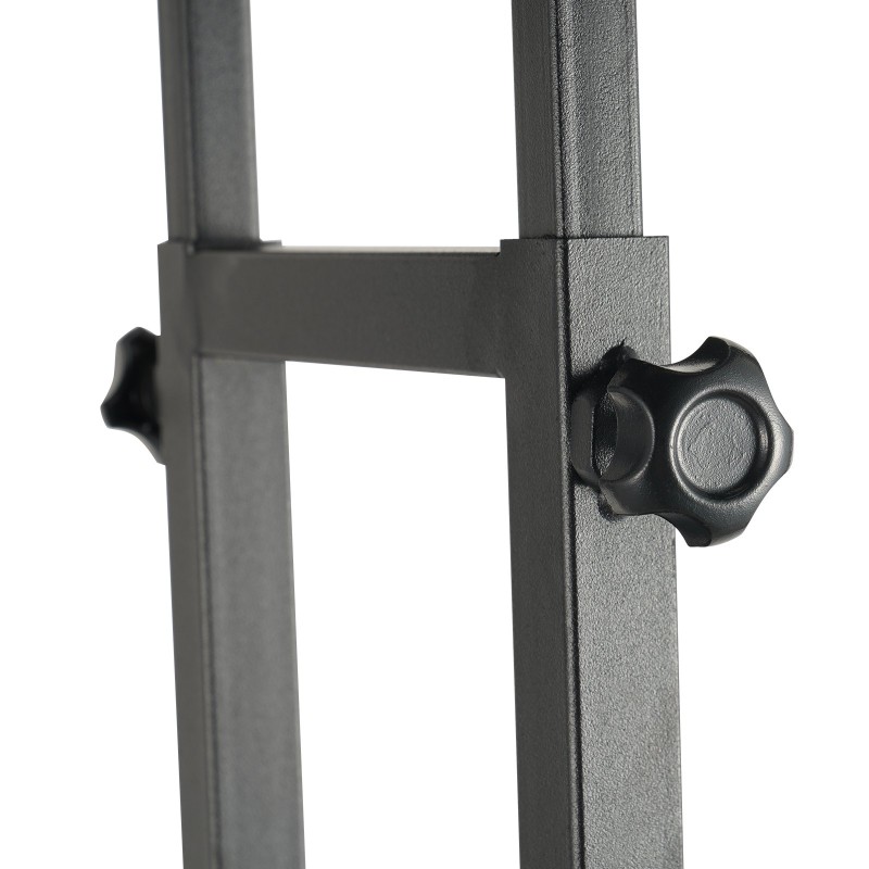 Tukevan metallisen neliöpohjan ja 3 mm paksuuden ansiosta jalallinen julisteteline pysyy hyvin pystyssä. Kulmiin sijoitetut iskunvaimennussienet lisäävät vakautta ja vähentävät telineen huojumista sekä suojaavat lattiaa naarmuilta.