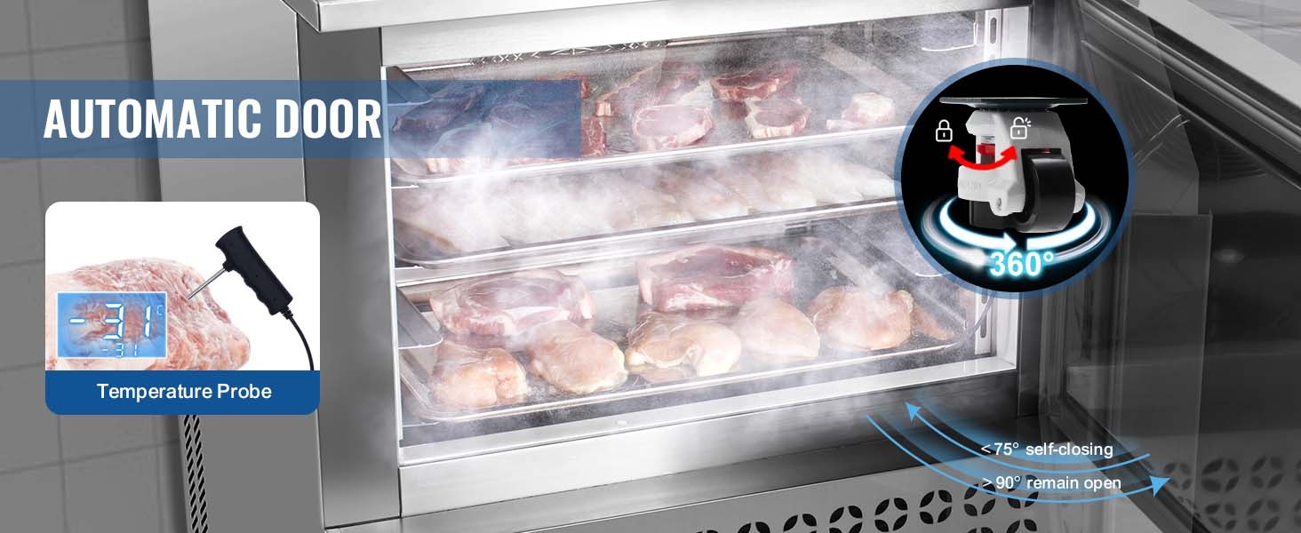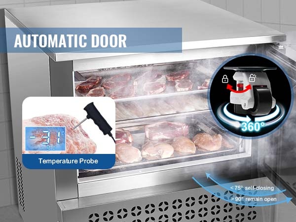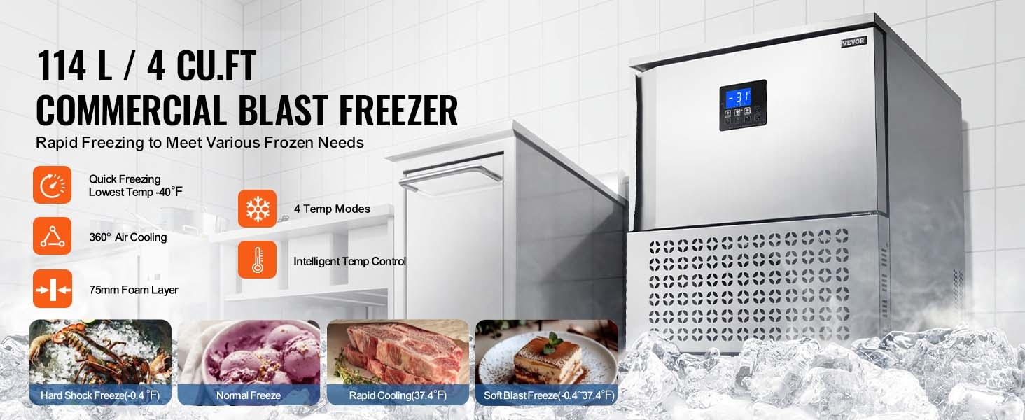 Tämä 114 L / 4 Cu.ft pikalämpötilapakastin on suunniteltu ammattikäyttöön ravintoloihin, suurkeittiöihin ja elintarvikevalmistukseen. Laitteella voi pakastaa nopeasti erilaisia raaka-aineita, kuten hummeria, kuningasrapua ja lohta, säilyttäen niiden tuoreuden, rakenteen ja ravintoarvot sekä pidentäen säilyvyysaikaa.