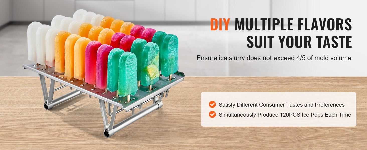 Valmista omia mehujäitä eri mauissa ja väreissä asiakkaidesi mieltymysten mukaan. Täytä seos muotteihin niin, että se ei ylitä 4/5 muotin tilavuudesta. Koneella voi valmistaa yhtä aikaa 40 kpl mehujäätä, joten se sopii erinomaisesti paikkoihin, joissa kysyntä vaihtelee ja makuja halutaan vaihtaa usein.