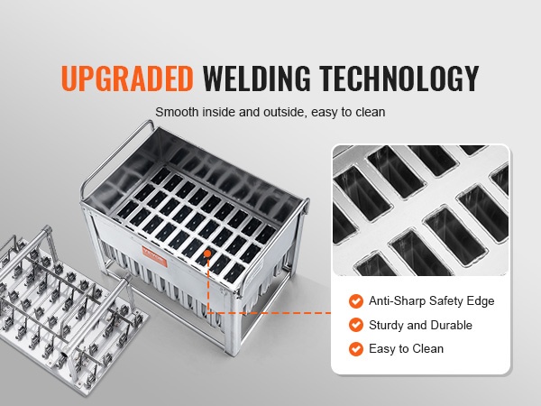 Muotit on valmistettu elintarvikekäyttöön soveltuvasta SUS304-ruostumattomasta teräksestä. Kun mehujäät ovat jäätyneet, nosta koko muotti, upota se puhtaaseen veteen noin 2–5 minuutiksi ja vedä sitten mehujäät helposti ulos. Valmiit mehujäät voidaan pakata kätevästi mehujääpusseihin säilytystä ja myyntiä varten.