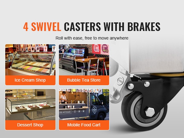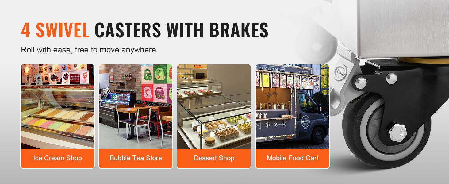 Koneessa on neljä pyörää, joiden ansiosta se on helppo siirtää esimerkiksi kylmäjuomabaareihin, teehen erikoistuneisiin liikkeisiin ja jälkiruokamyymälöihin. Pyörät takaavat vakauden käytön aikana ja helpottavat työpisteen järjestämistä.
