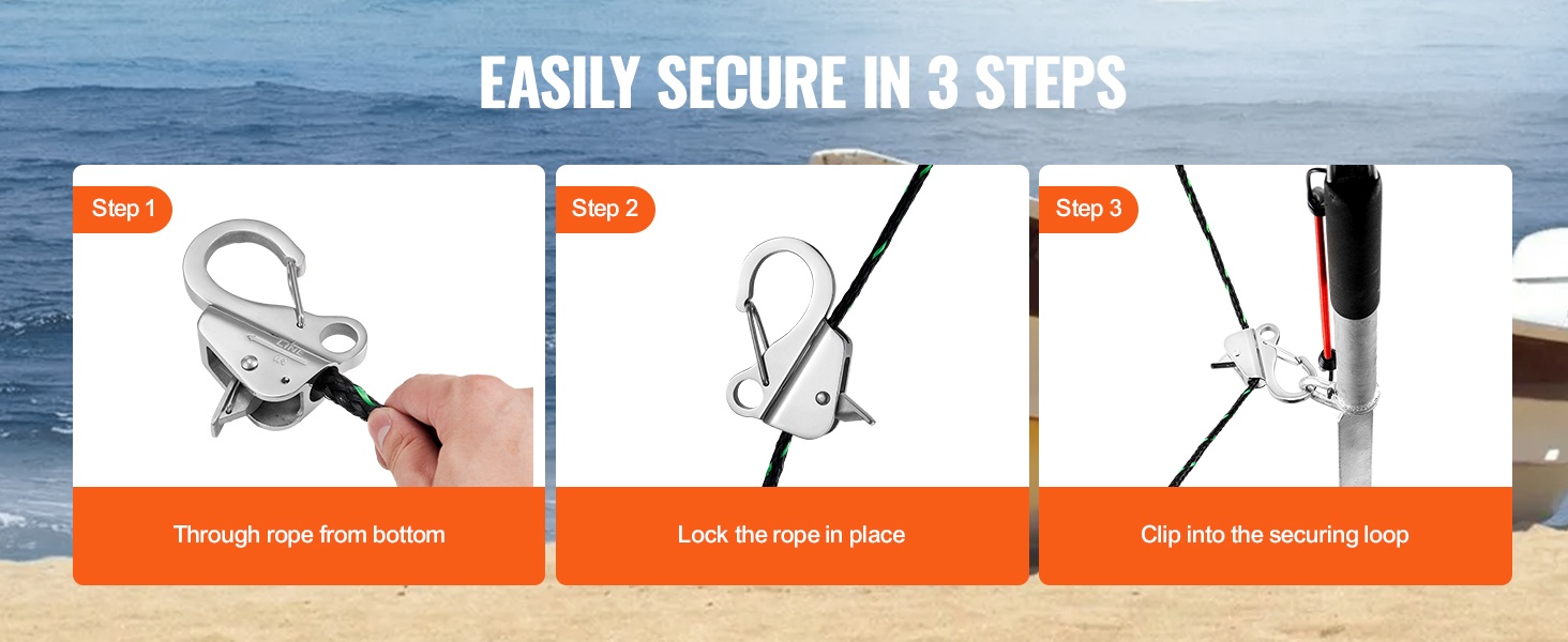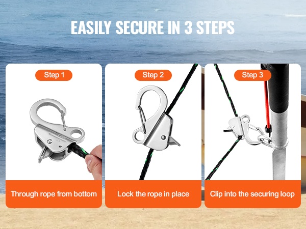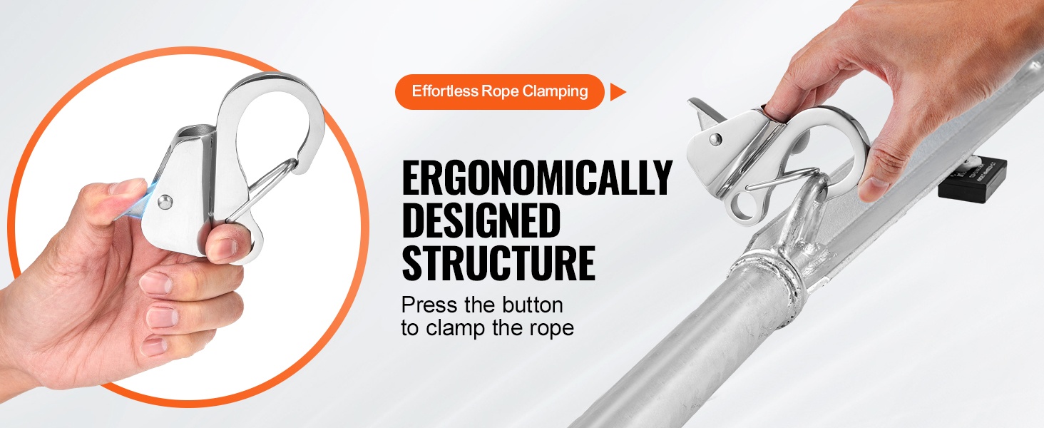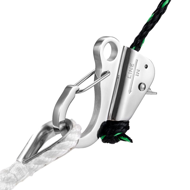 Liukukoukkurakenne ja lisätty köydenpuristusmekanismi helpottavat käyttöä. Köysi lukitaan painamalla liukumatonta painiketta, jolloin solmimista tai solmujen purkamista ei tarvita. Kun köysi on puristettu koukkuun, kiinnitys pysyy vakaana ja luotettavana.