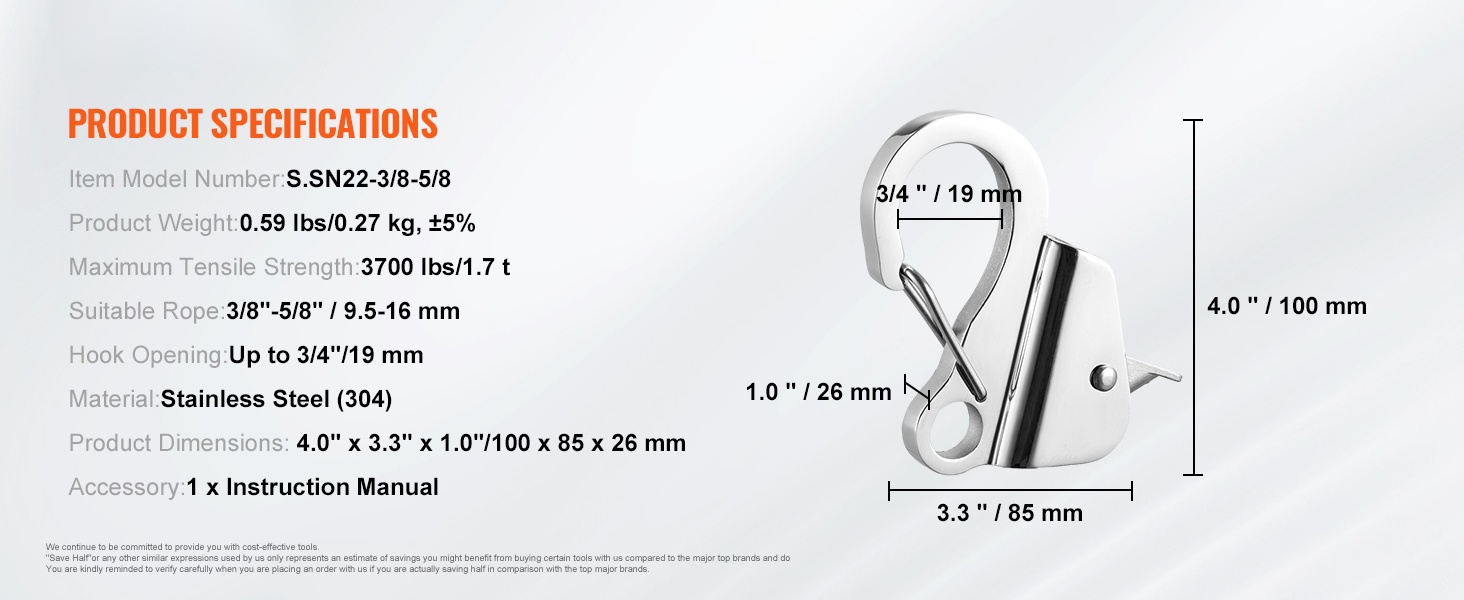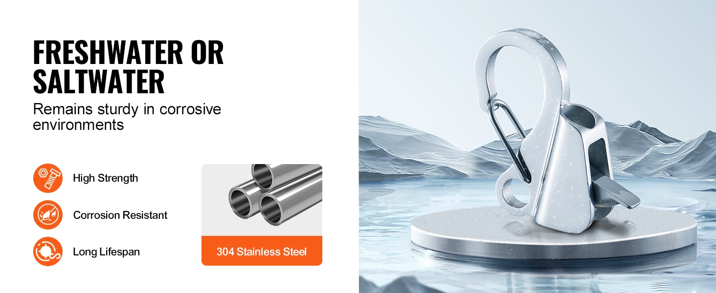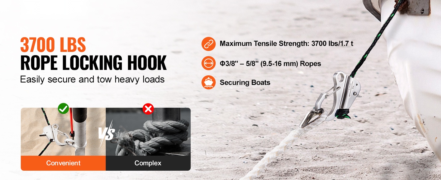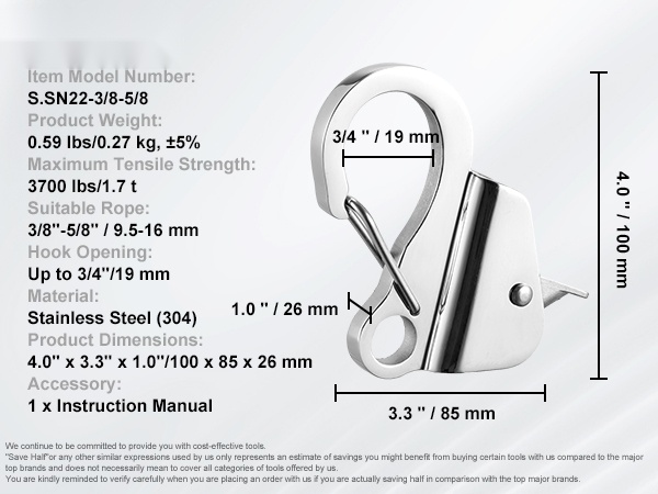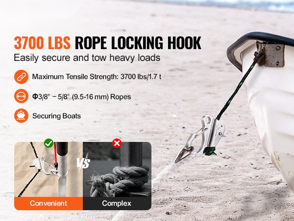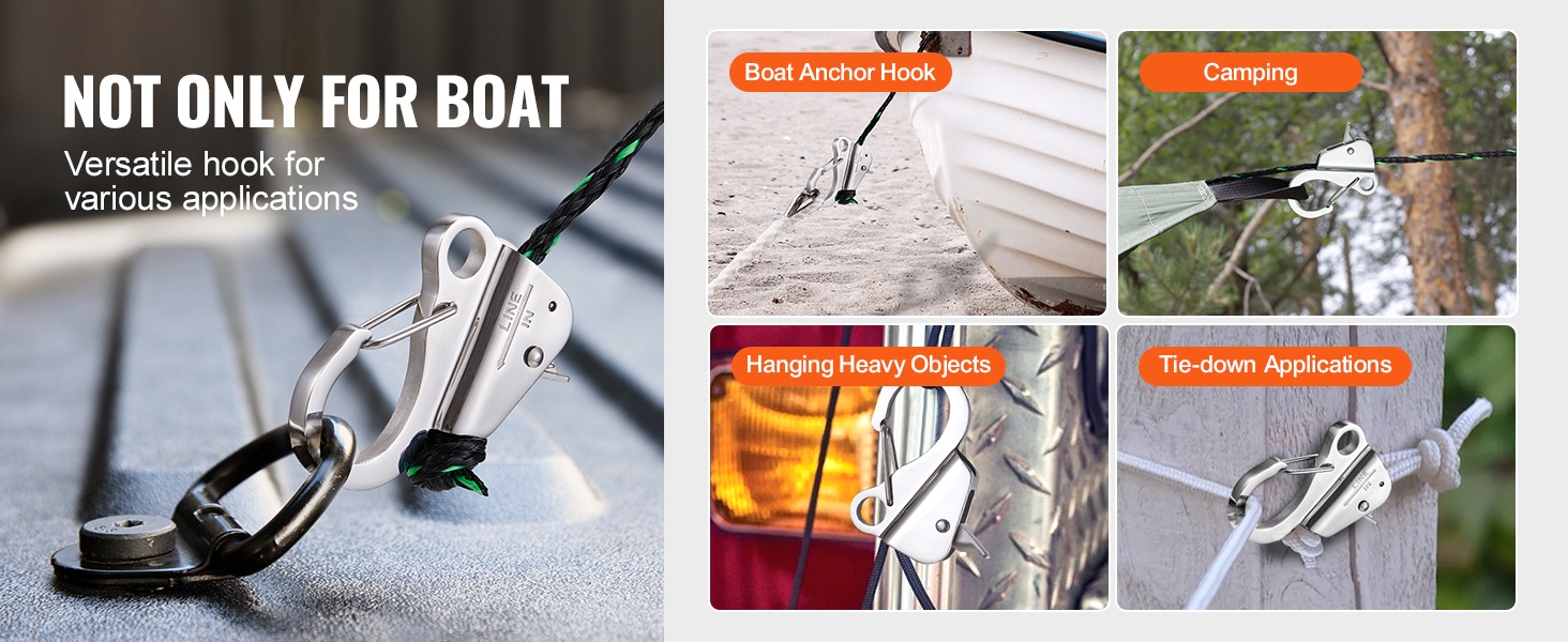 Tämä ruostumattomasta teräksestä (304) valmistettu ankkurikoukku helpottaa veneen kiinnitystä ja raskaiden kuormien vetämistä. Koukku lukitsee köyden tukevasti ja kestää jopa 3700 lbs / 1.7 t vetojännityksen, mikä tekee siitä luotettavan apuvälineen vaativiin olosuhteisiin.