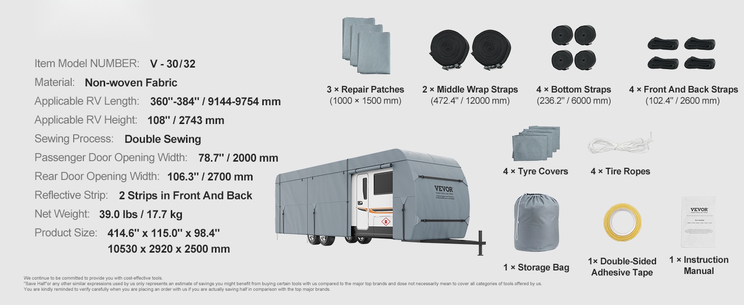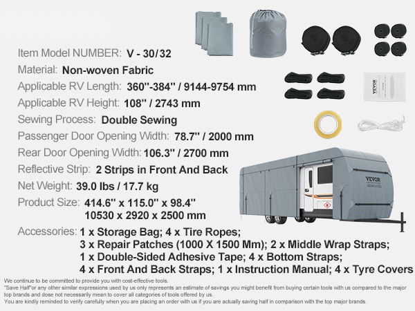 Peite on suunniteltu erityisesti 28-31 ft asuntoautoille, jotta istuvuus olisi mahdollisimman hyvä. Tarkat mitat omasta ajoneuvosta auttavat varmistamaan oikean koon valinnan, ja peite suojaa kattavasti sekä kattoa että sivuja.