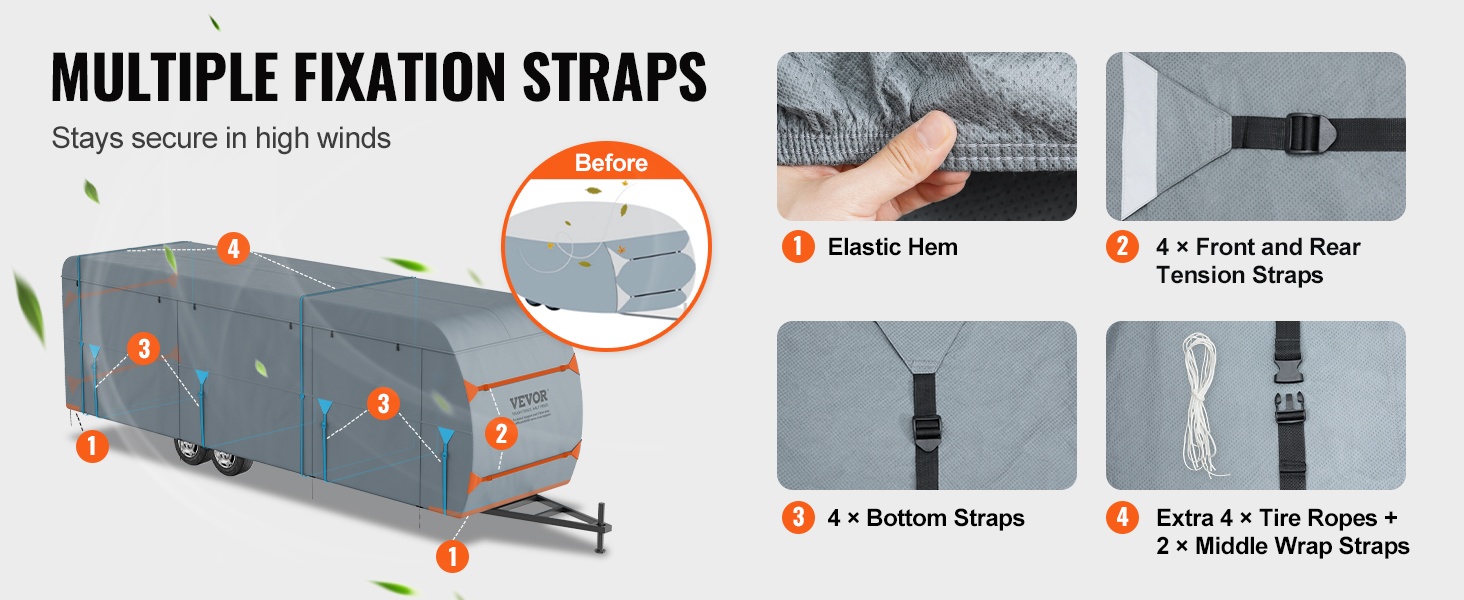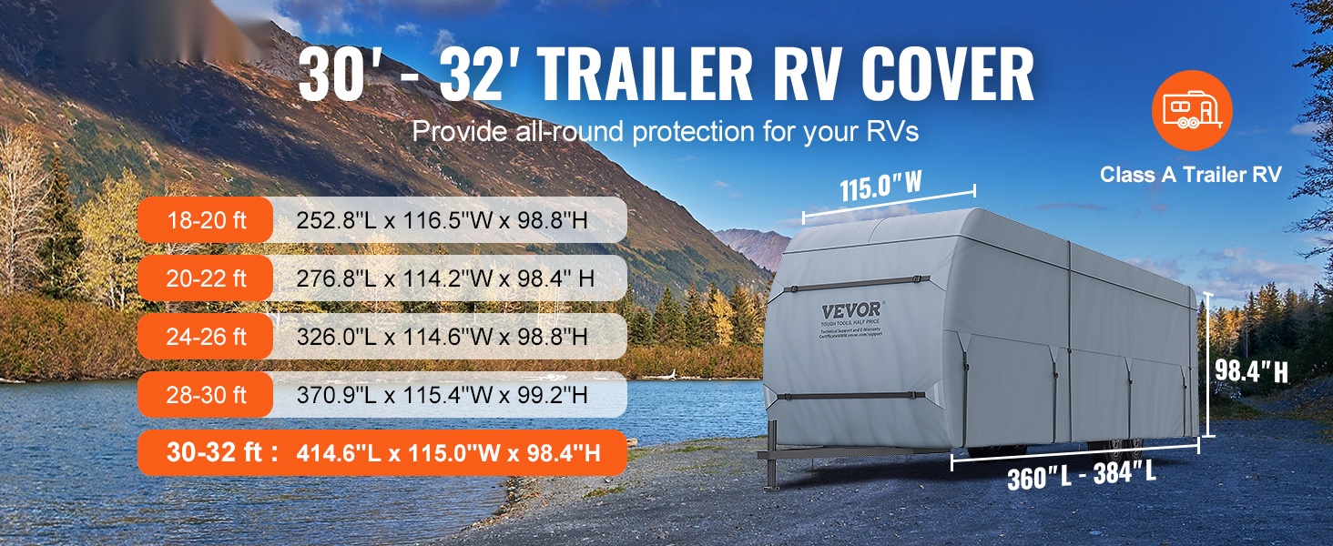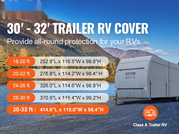 Matkailuperävaunun suojapeite on suunniteltu sopimaan 28-31 ft luokan A asuntoautoihin ja matkailuvaunuihin. Peite istuu tiiviisti, suojaa ajoneuvoa ympäri vuoden ja auttaa ehkäisemään auringon, sateen, lumen ja lian aiheuttamaa kulumista.