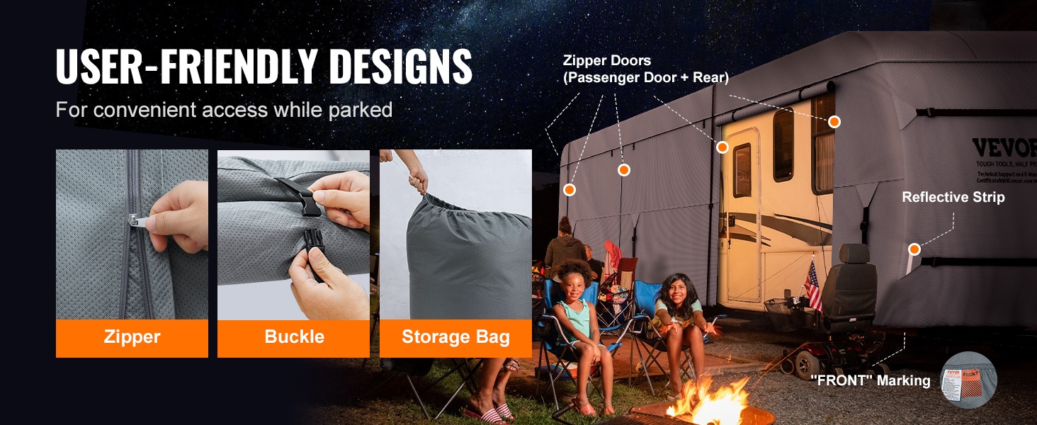 Sivuilla ja takana olevat vetoketjuovet mahdollistavat pääsyn asuntoautoon ilman, että peitettä tarvitsee poistaa kokonaan. Vetoketjujen alaosat on vahvistettu leveällä tarrakiinnityksellä, ja etu- sekä takaosassa olevat heijastinnauhat parantavat ajoneuvon näkyvyyttä pimeässä ja lumisissa olosuhteissa.