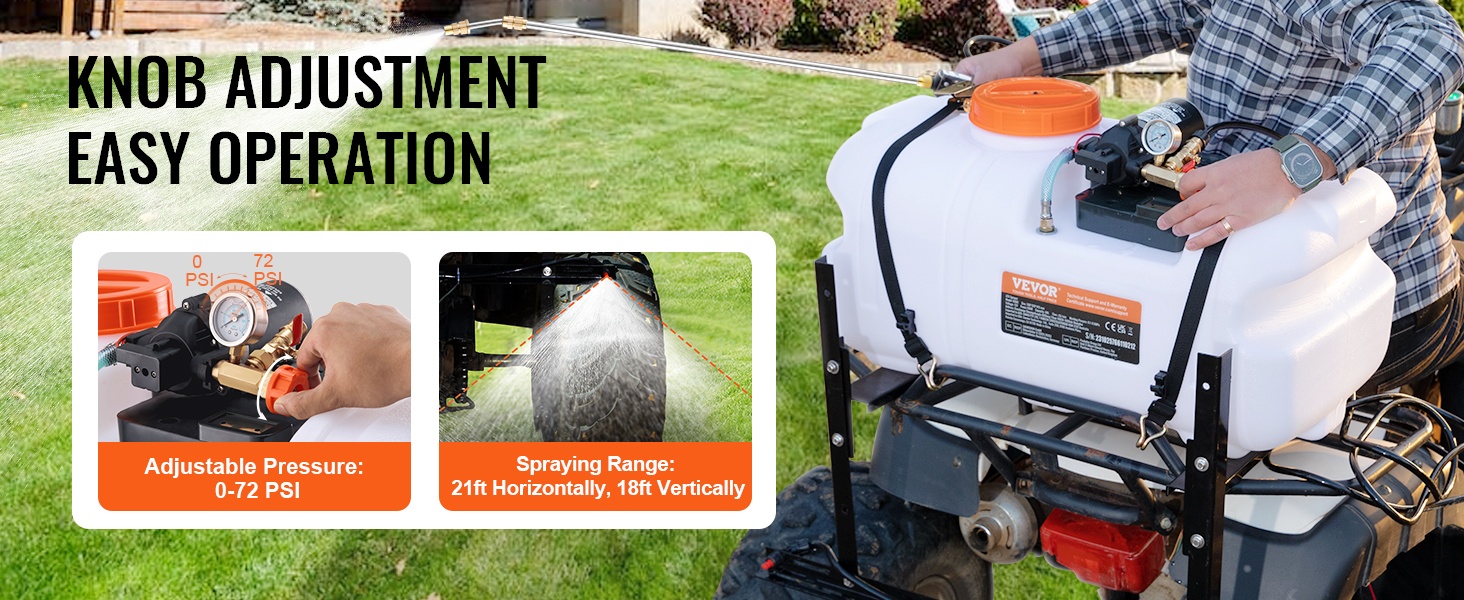 Paineensäädön nuppi mahdollistaa ruiskutuspaineen portaattoman säädön välillä 0–72 PSI eri käyttökohteisiin. Voit ruiskuttaa tarkasti, vaakasuora kantama on noin 21 ft ja pystysuora kantama noin 18 ft.