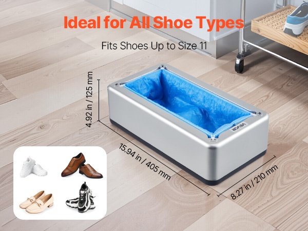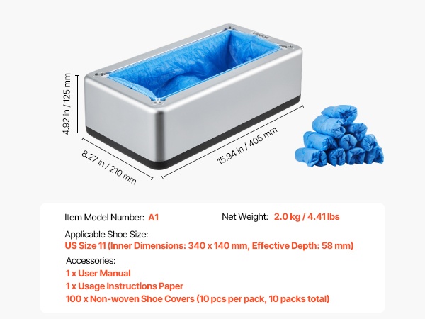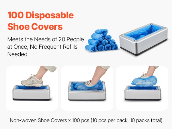 Kone toimitetaan 100 liukumattomalla kertakäyttöisellä kenkäsuojalla, mikä riittää jopa noin 20 henkilölle ja vähentää täyttötarvetta. Se on yhteensopiva erikokoisten kenkien kanssa aina suurimpaan miesten koon US 11 / EU 44 saakka, joten se sopii useimmille käyttäjille.